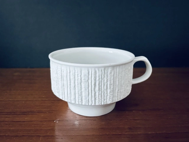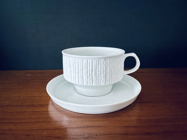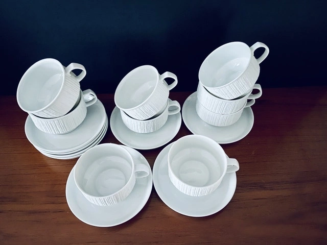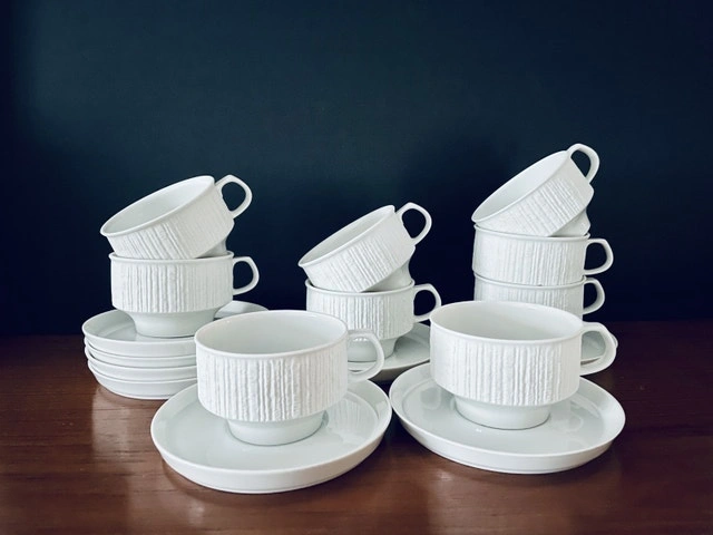 Vintage Mid Century Modern Germany porcelain Rosenthal Thomas coffee cups and saucers. Designed by Richard Scharrer. Extremely aesthetic. Price is for total 8 saucers and 9 cups. Note: I have a coffee/tea pot and some plates of the same serial “Arcta White” for sale.