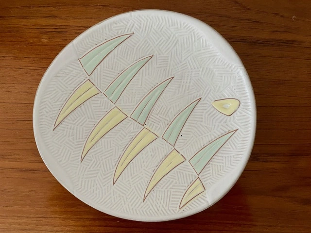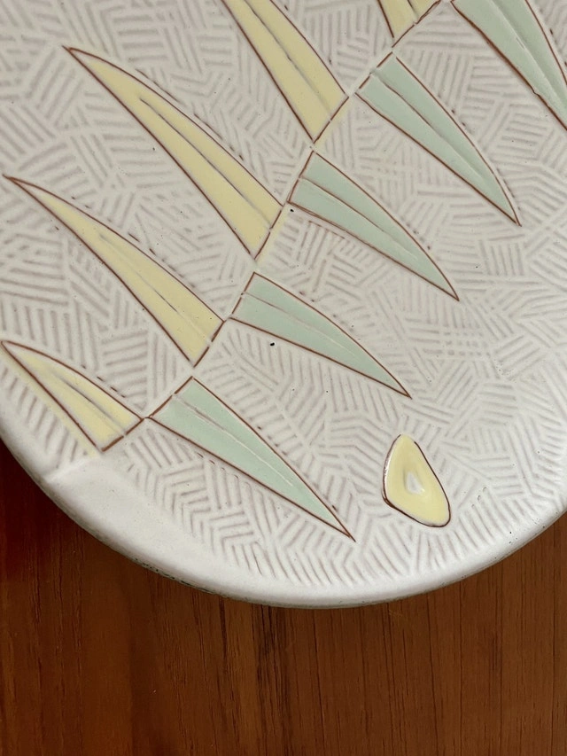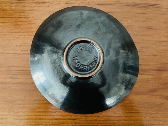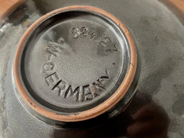 Beautiful large West Germany Bowl with stylized leaf relief decor. Embossed marking: 824/27 It is not round but slightly asymmetrical. Excellent condition. Diameter: 11.4” Height: 2.3”