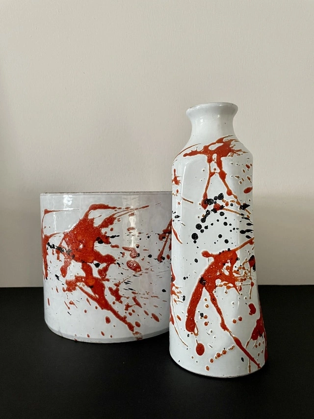 Vintage West Germany Pottery. According to the external patterns Fat Lava, I would think they were designed and made by the same manufacturer. Prefer selling them together. The cylinder planter: Diameter: 7.5” Height: 6.5” The vase: Height: 8”