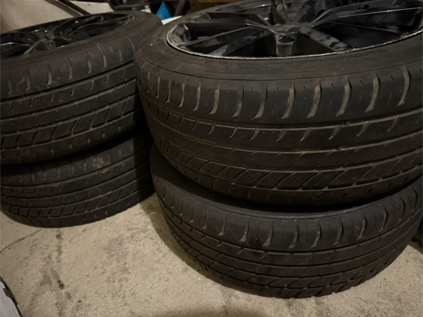 Selling a set of four APT wheels with tires. They're black and in used condition. The tires are labeled SMACHER. 225/45Rz/18