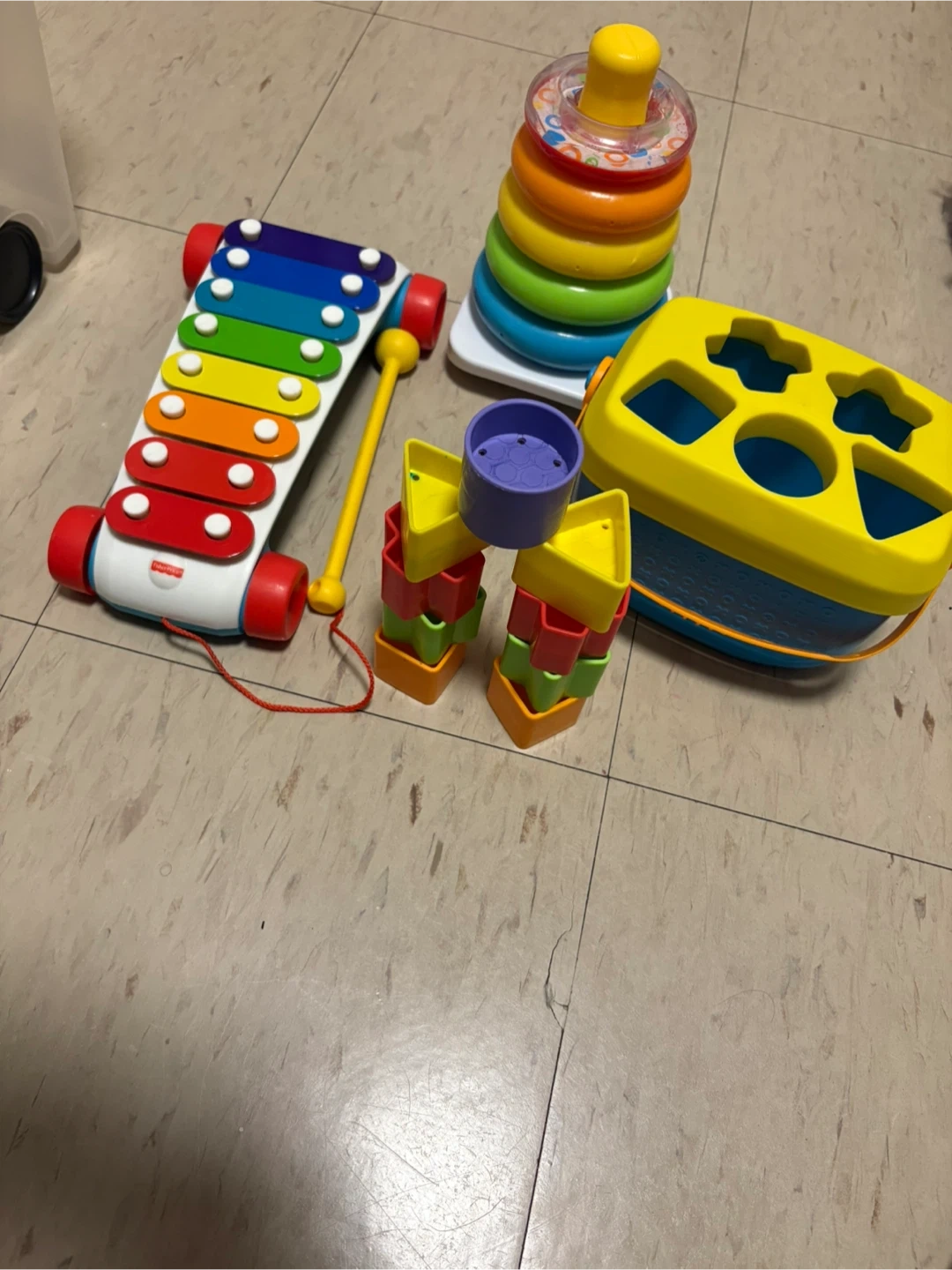 Selling a bundle of Fisher-Price baby toys! Includes a xylophone, shape sorter, ring stacker, and stacking blocks. Great for early learning and development.