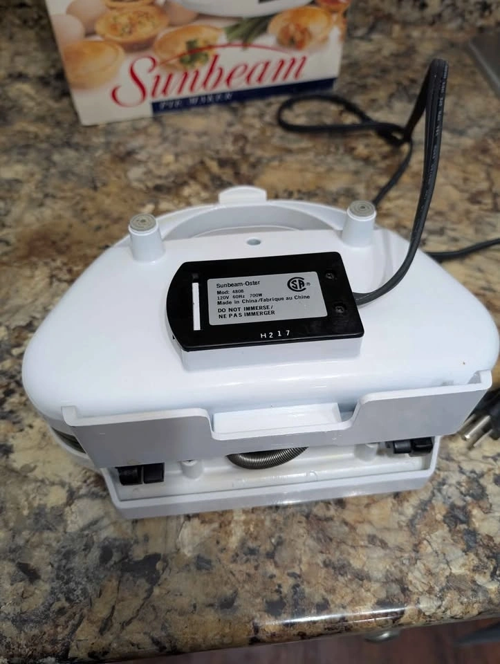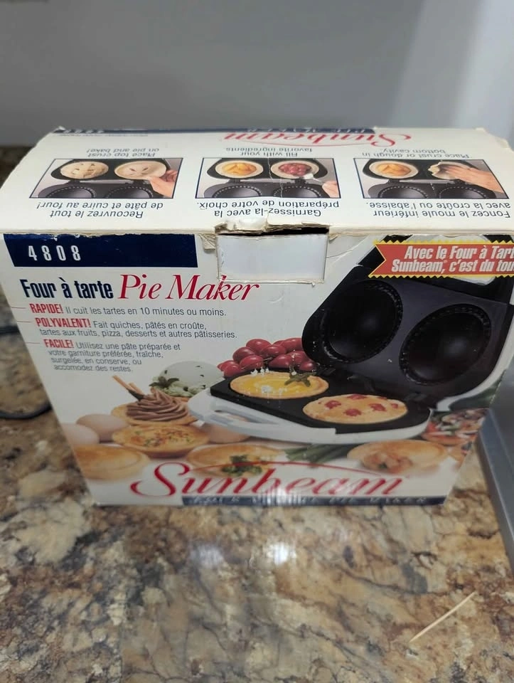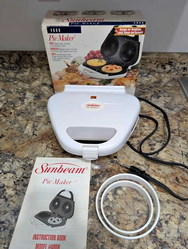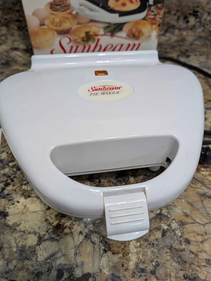 We are downsizing so I am selling this Sunbeam Pie Maker. It's very clean, always stored in the original box. It has the recipe book and the pastry cutters. The box has some wear on it. It makes great little pies both sweet and savoury. It's time for someone else to enjoy this great little machine.