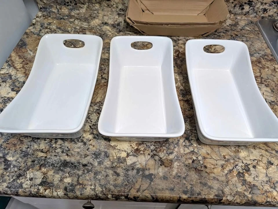 Selling a set of three serving dishes. These will be perfect for Christmas dinner. In like new condition, no chips no scratches and no stains. Used twice. They are microwave, oven, freezer and dishwasher safe. Each dish is 6 cm (2.25 inches) deep in the center. Bottom is 12 x 22 cm (4.75 x 8.75 inches). Top is 15 X 28 cm ( 6 x 11 inches).