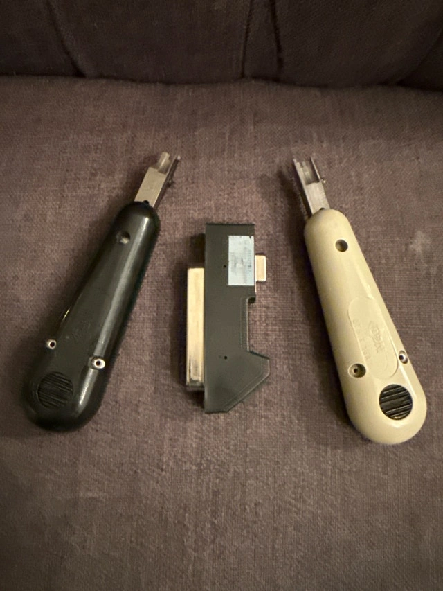 I'm selling a set of used punch down tools, perfect for networking and telecommunications work. The set includes two punch down tools and an IP media processor. The tools are in fair condition, showing signs of use but fully functional. Here are the details: