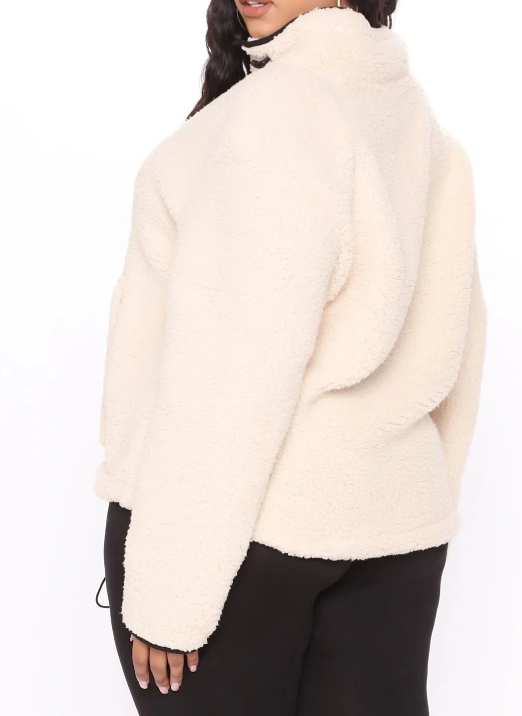 Selling a cream-colored sherpa pullover. It's super cozy and perfect for chilly days! The pullover has a quarter-zip neckline and a front pocket.