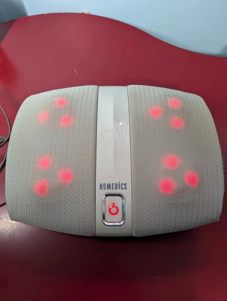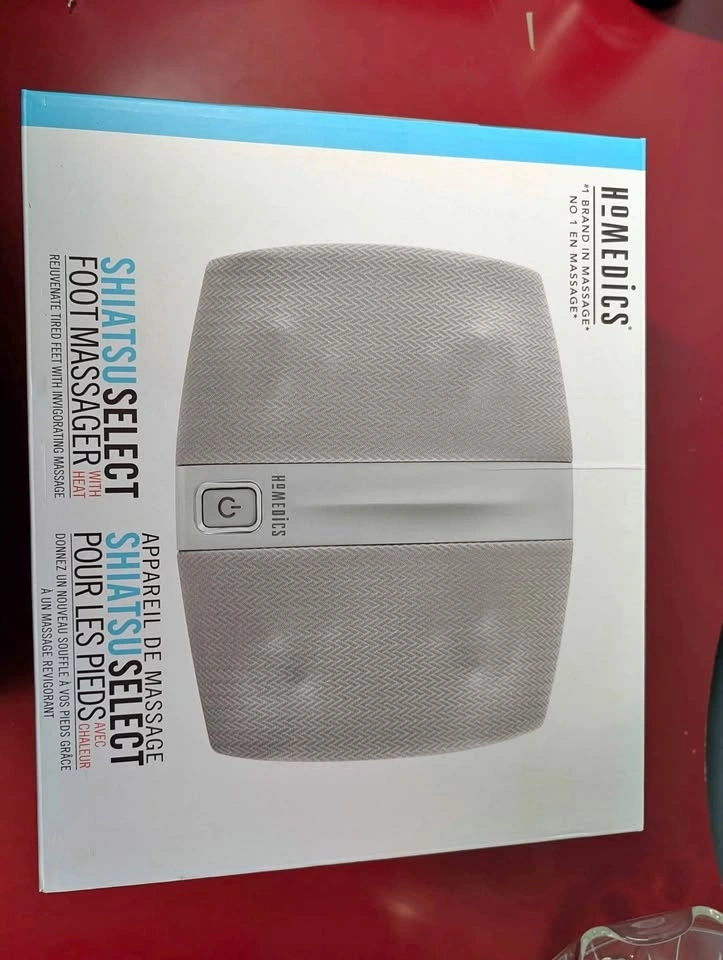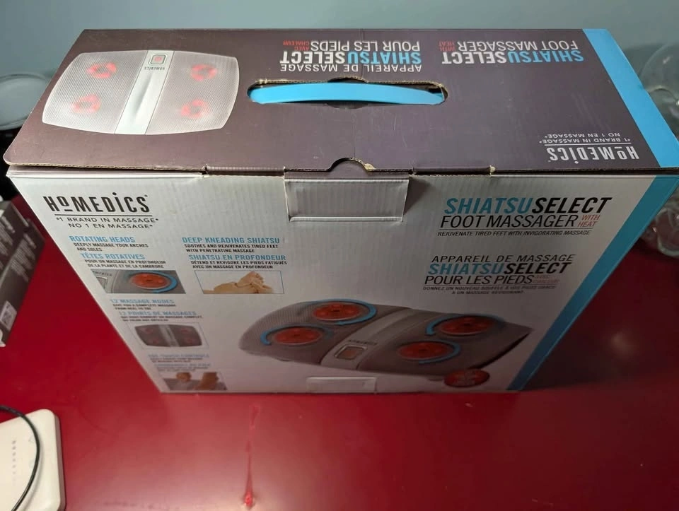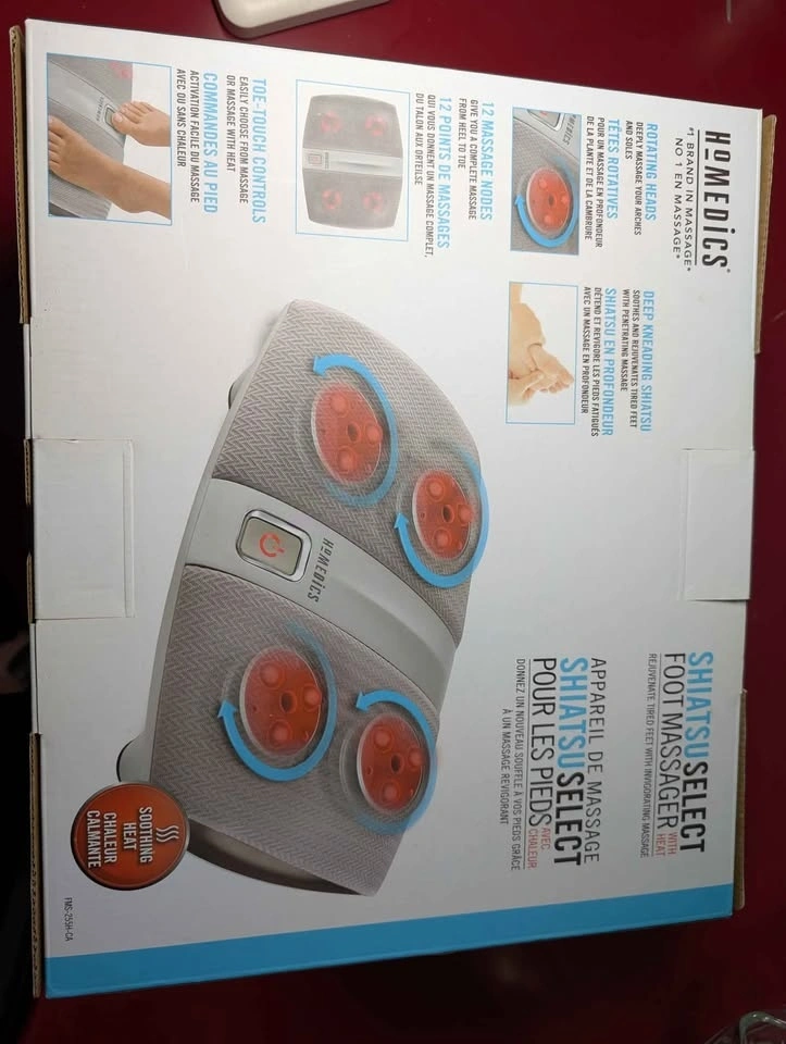 Downsizing, this is too big to take with us so we are selling a shiatsu foot massager. Two settings one with and one without heat. Works perfectly. Used only a few times. No wear on the cloth. It was always stored in the original box. Check photos for more details