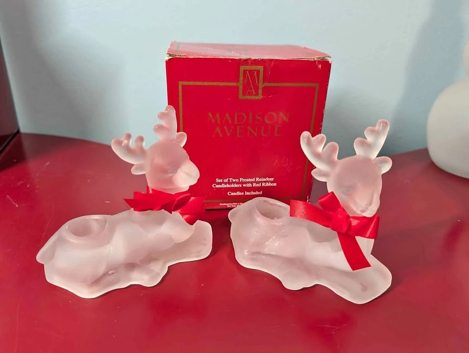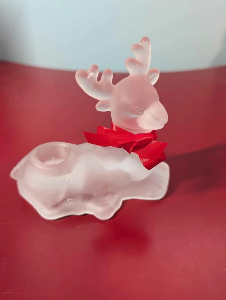 Selling a set of two frosted reindeer candle holders. Each one is adorned with a red ribbon around their neck. Candle holders stand 4 in tall (10 cm) and have a base of 4 and 1/2 inches (11 cm) comes in the original box.