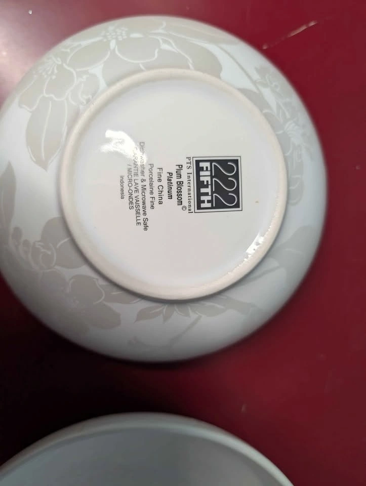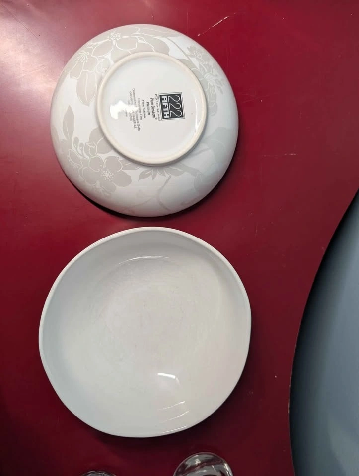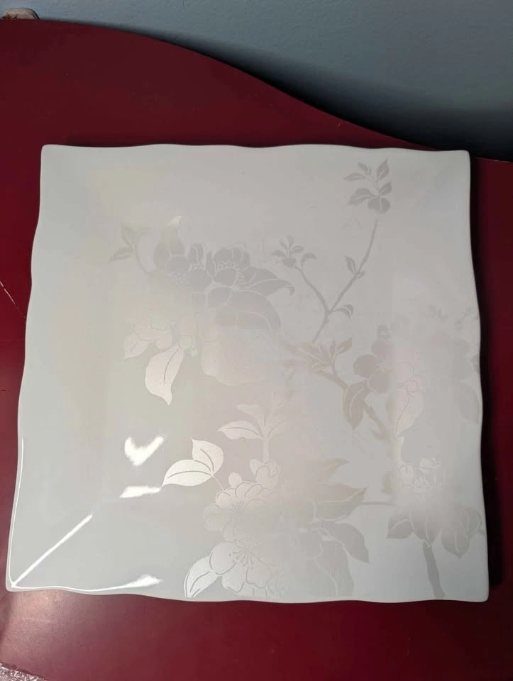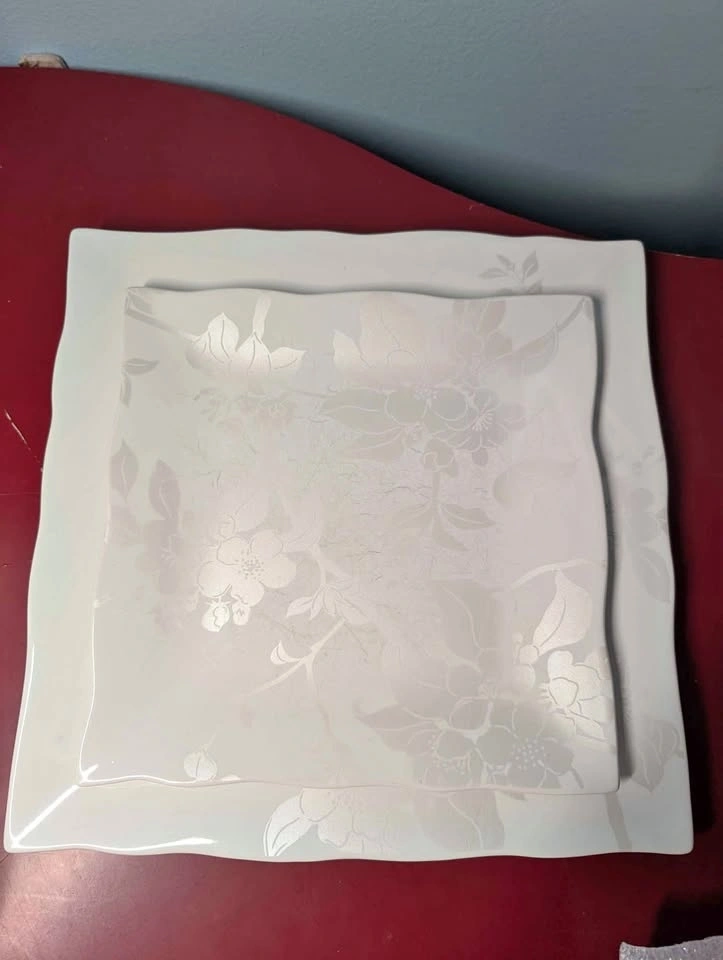 Selling some porcelain dishes. Six each of dinner plate, small plate and bowl. Elegant pattern goes with any decor. Large plate is 10 inches square (25 cm) small plate is 8 inches square (20 cm). Bowl is 6 inches diameter ( 15 cm). Microwave and dishwasher safe.