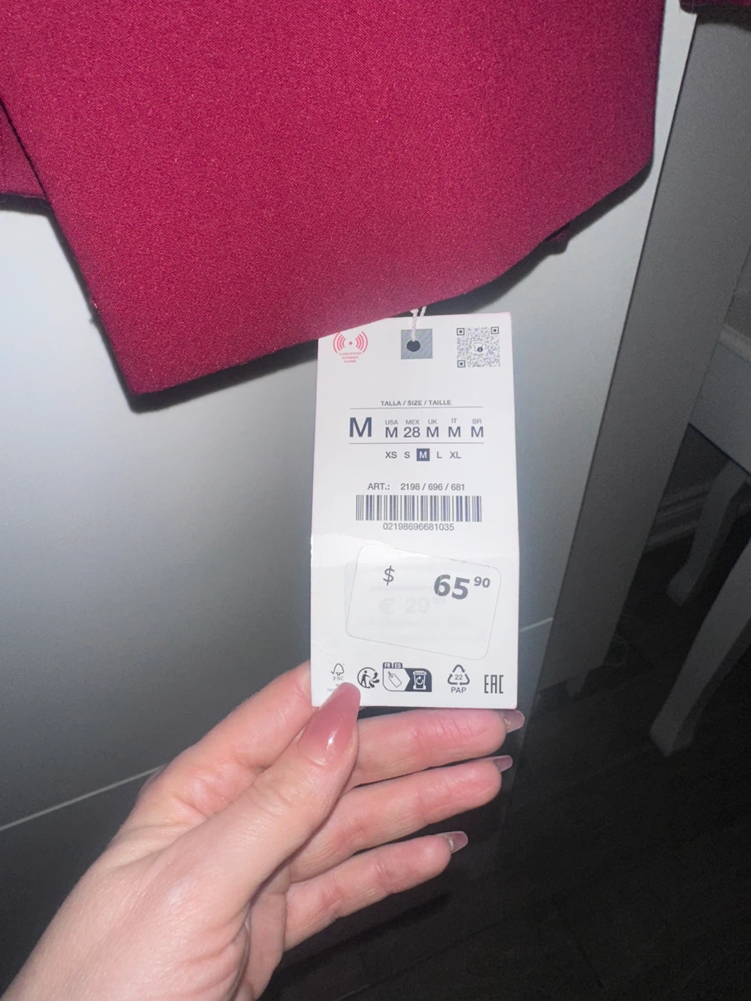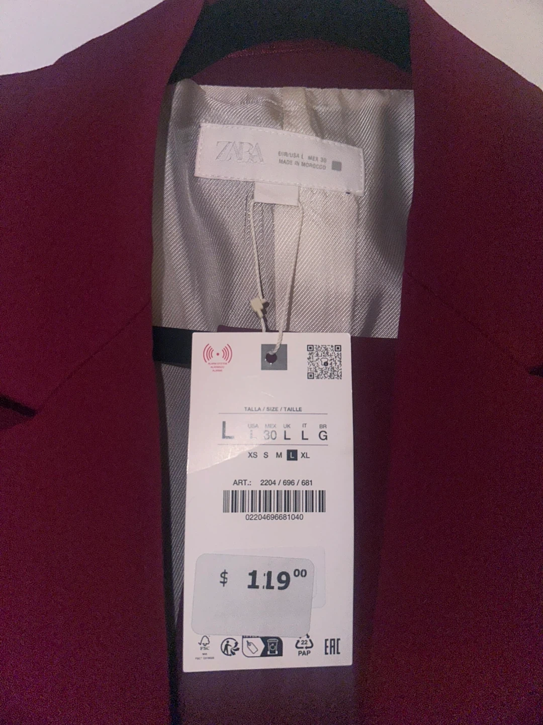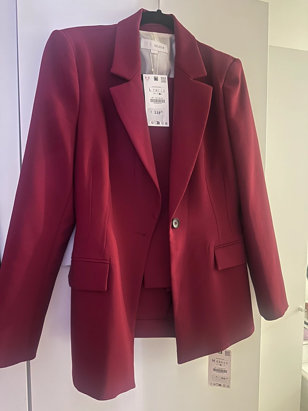 Selling a Zara blazer in size L and the pants are a M. It's a beautiful burgundy colour! Blazer originally bought for $119 and the pants $65 tags still on!