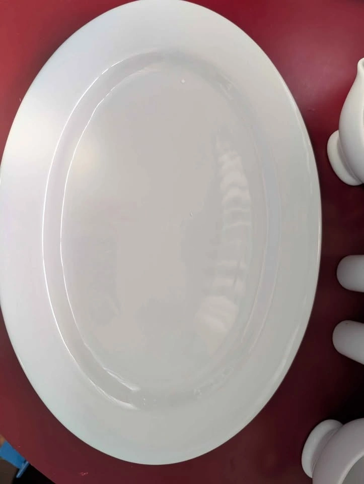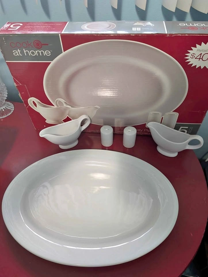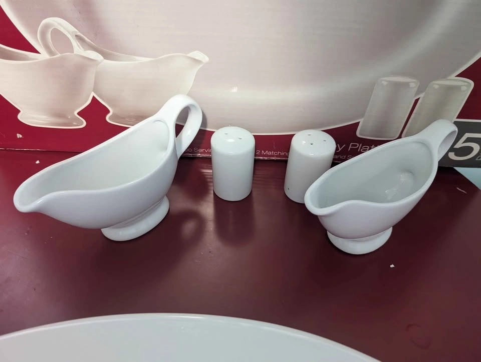Selling a five piece turkey platter set. Includes the oval platter (18 x 13 inches) two gravy boats, one for each end and salt and pepper shakers. All in perfect condition with the original box. The box has some wear on it. Ceramic and dishwasher safe. It's always been hand washed by us.