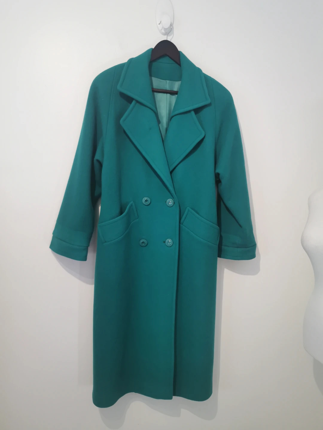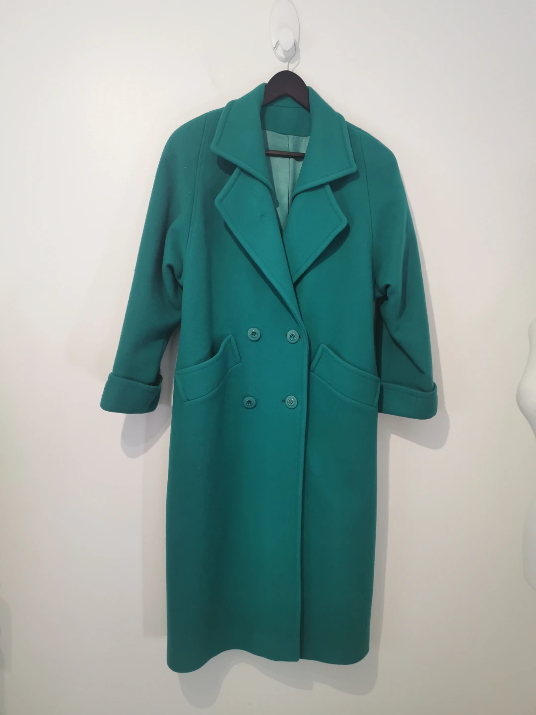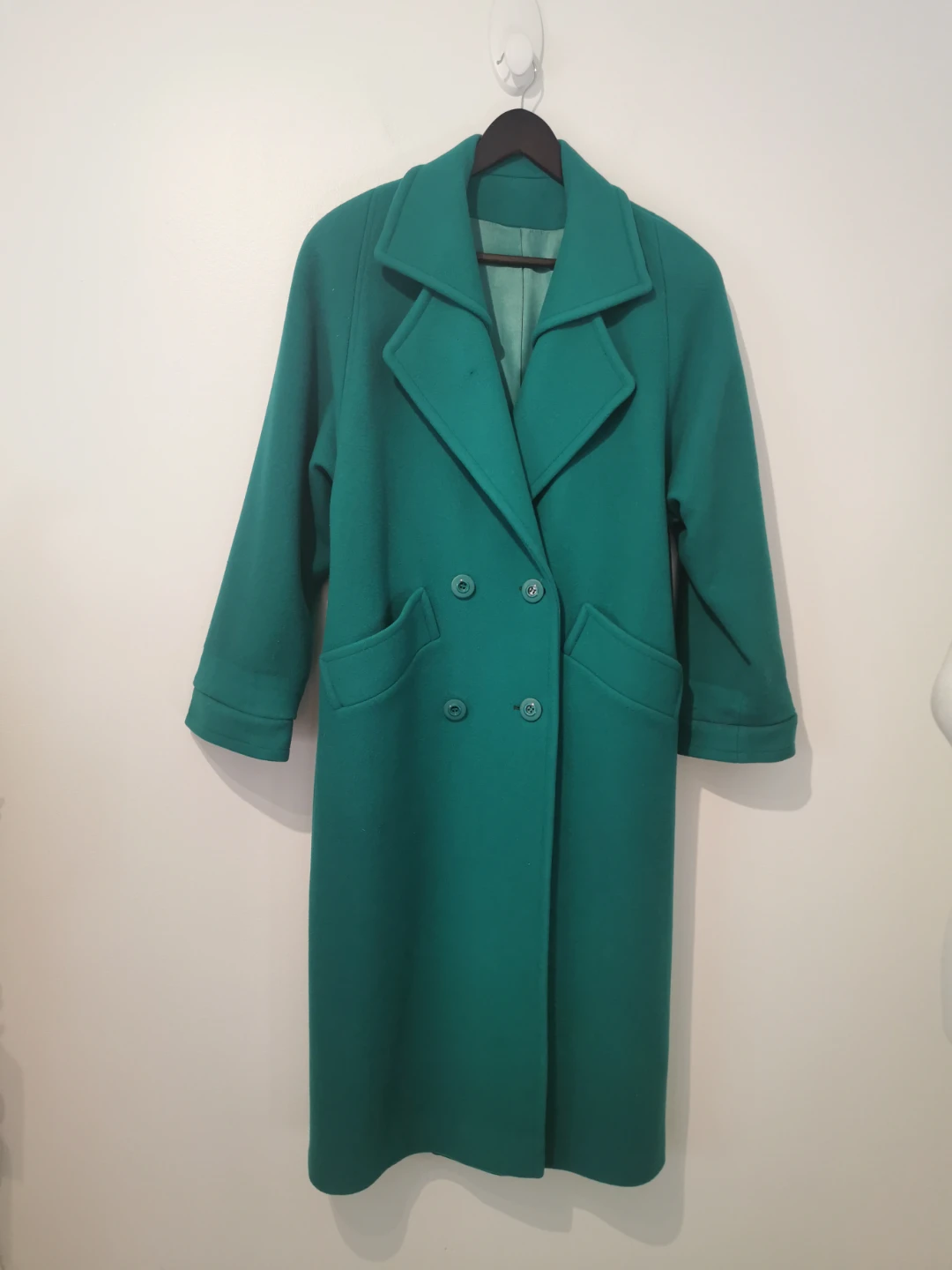 Selling a stylish green double-breasted wool coat! It looks great and is perfect for keeping warm during the colder months. It features a classic design with button detailing and functional pockets.
