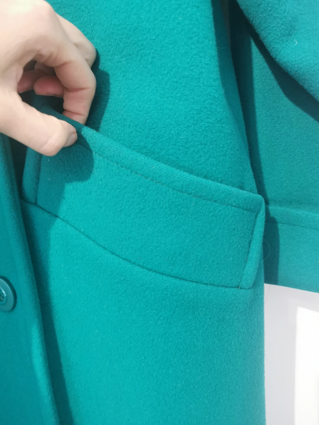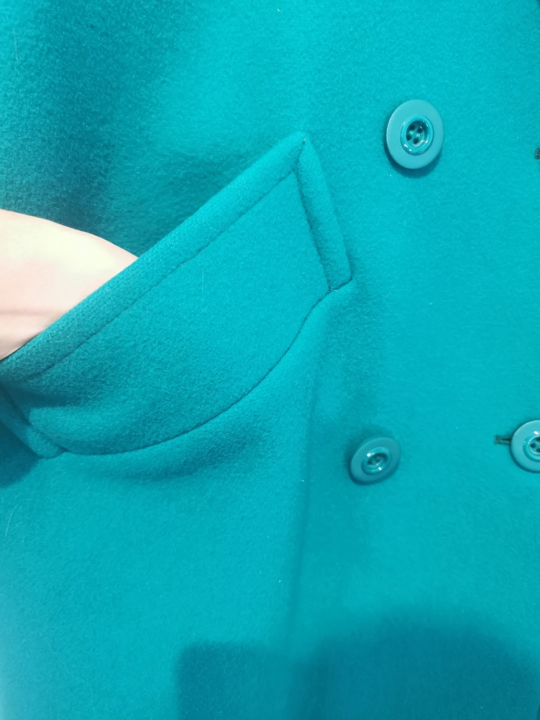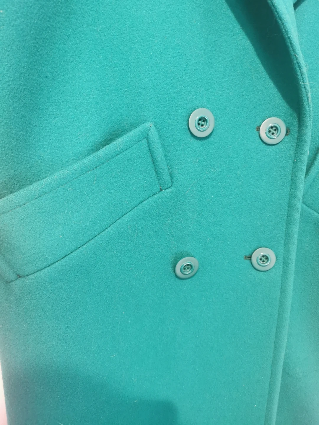 Selling a stylish green double-breasted wool coat! It looks great and is perfect for keeping warm during the colder months. It features a classic design with button detailing and functional pockets.