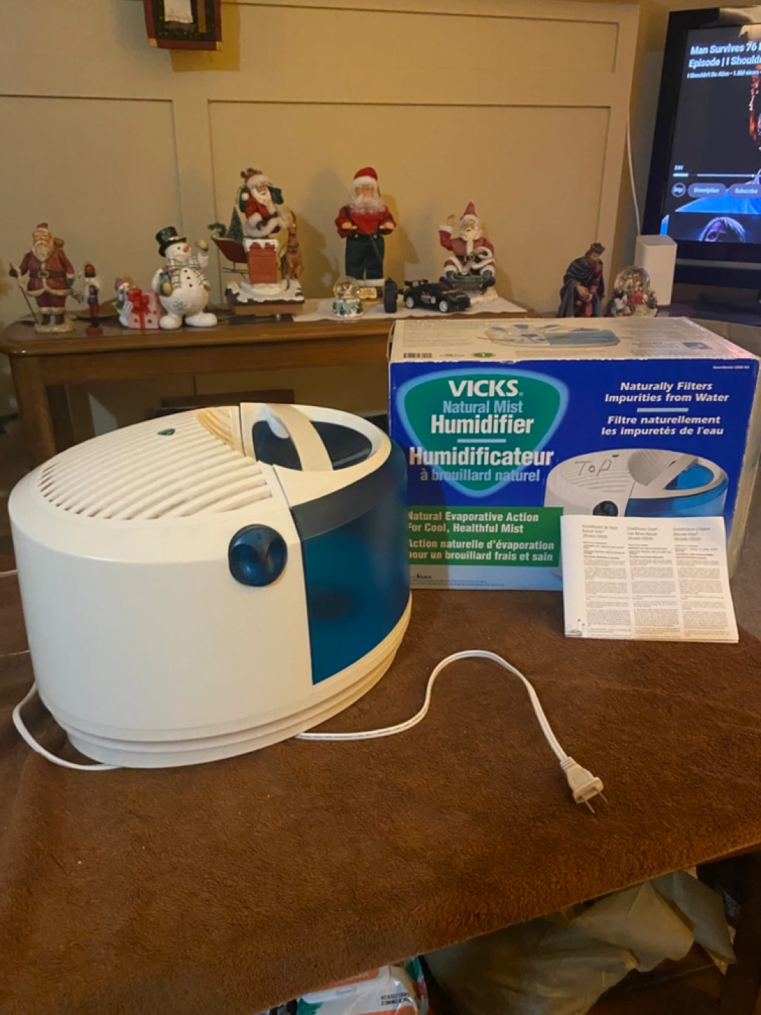 NEW NEVER USED a Vicks Natural Mist Humidifier. MODEL-V3500-WH naturally filters impurities from water for a pure, natural, healthful mist. It features natural evaporative action for a pure, natural, healthful mist. Box included!