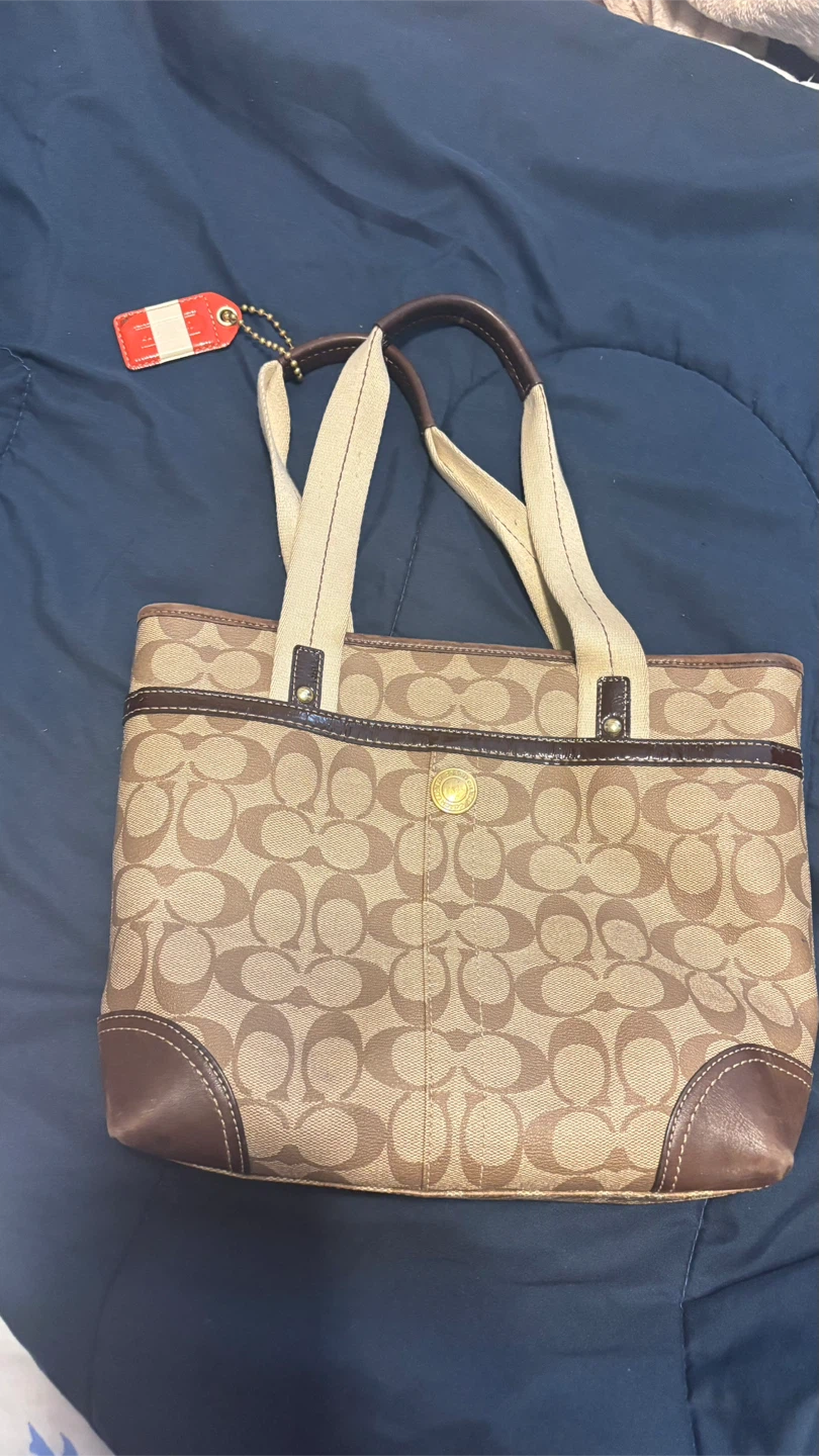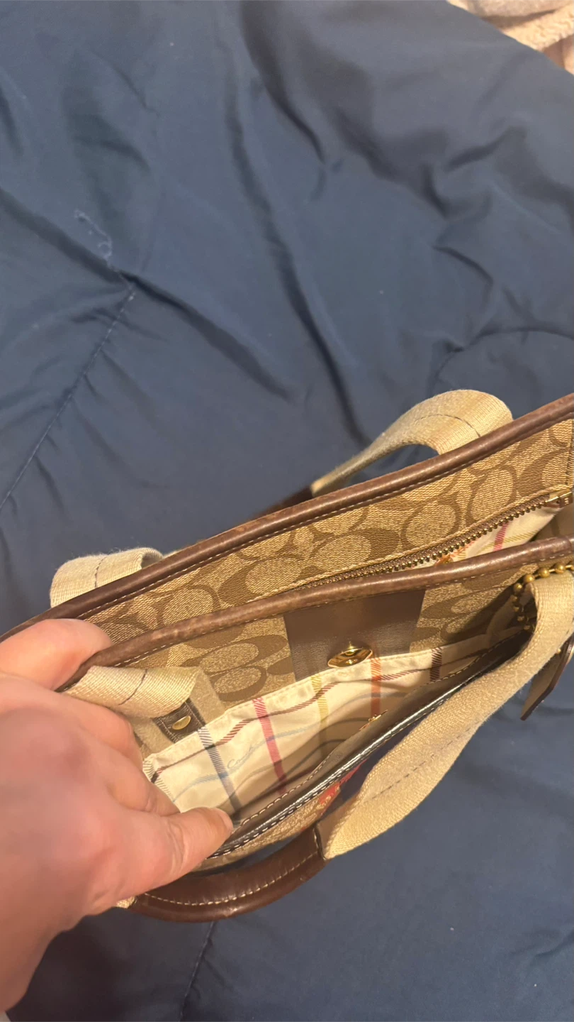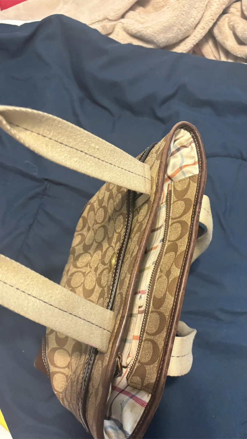 This is a Coach tote bag featuring the signature Coach pattern. It has brown leather accents and beige straps. The bag has a zip closure and an interior pocket. It's in good condition!