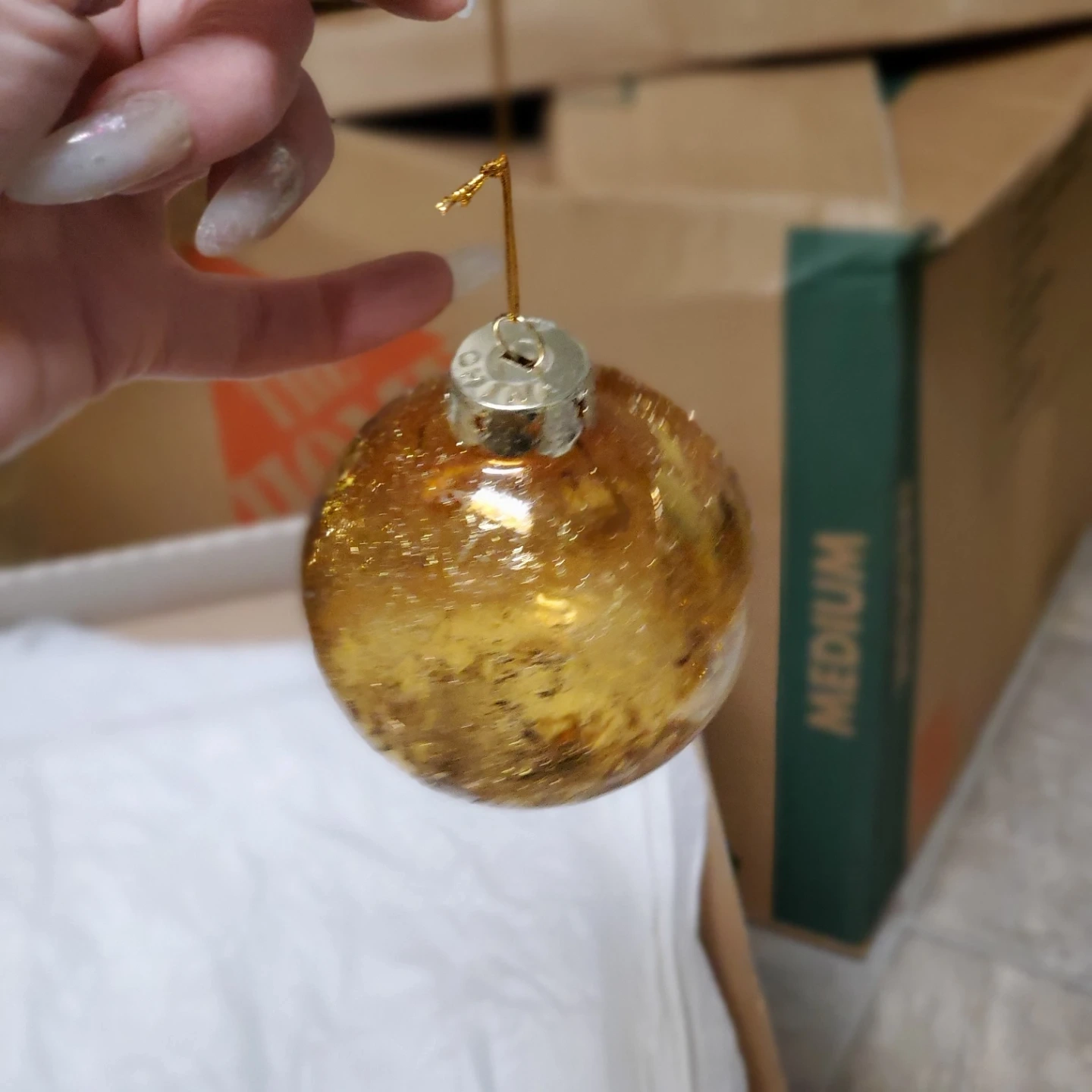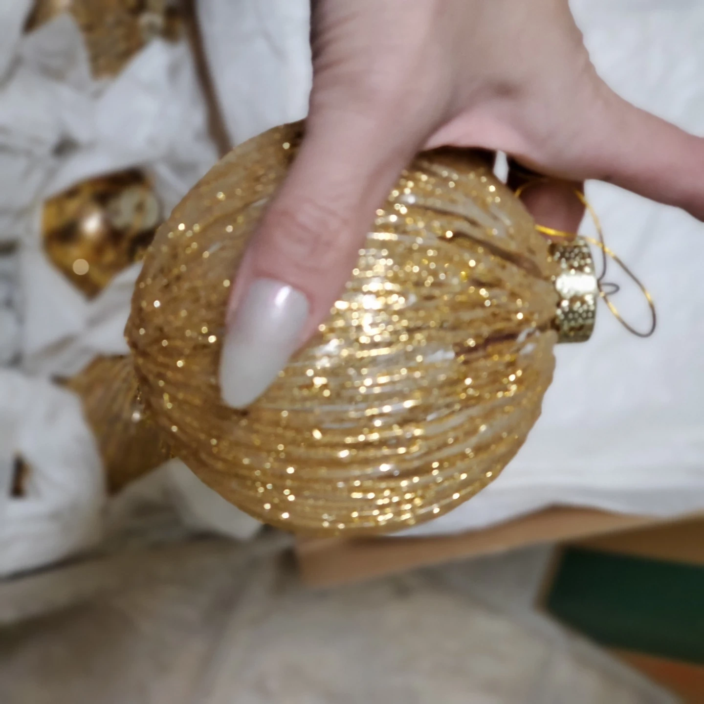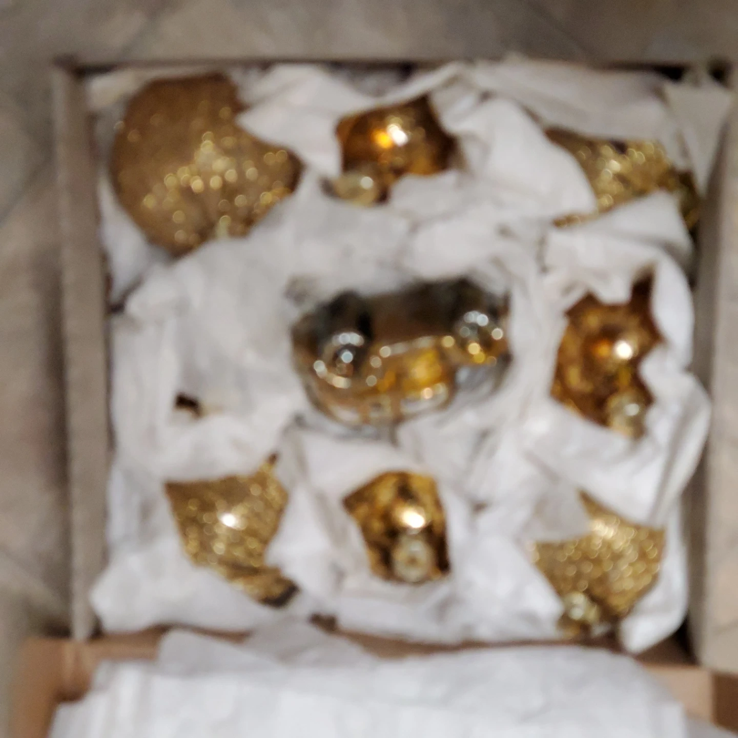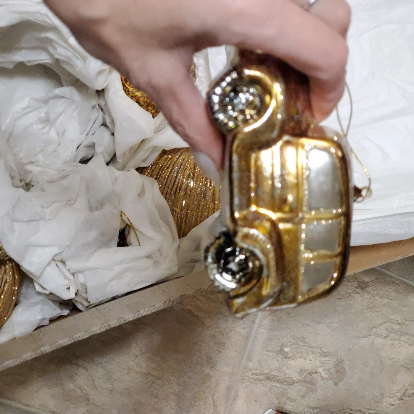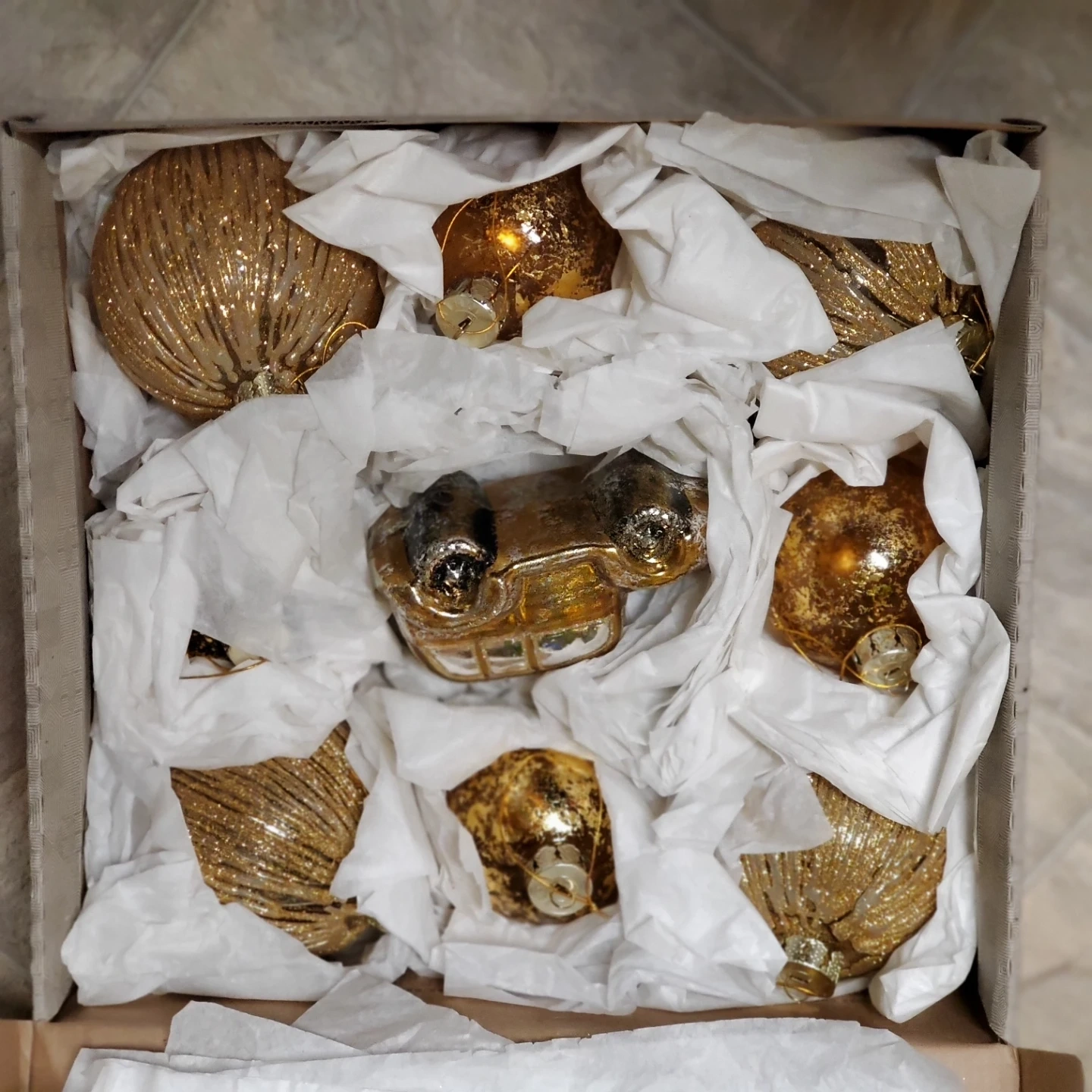 Selling a set of 7 gold-coloured Christmas ornaments. They come in various shapes, including a car and round baubles. Comes with the original box