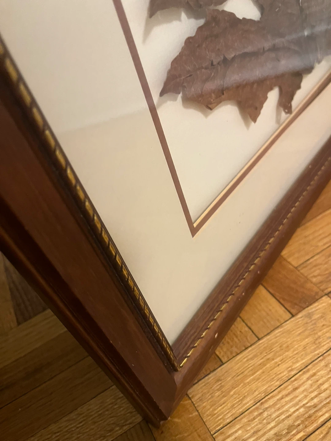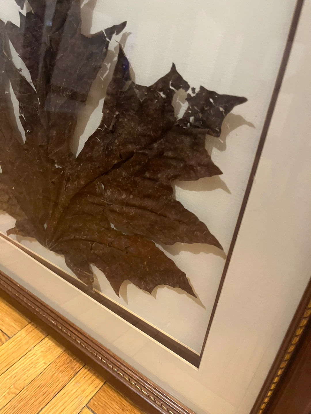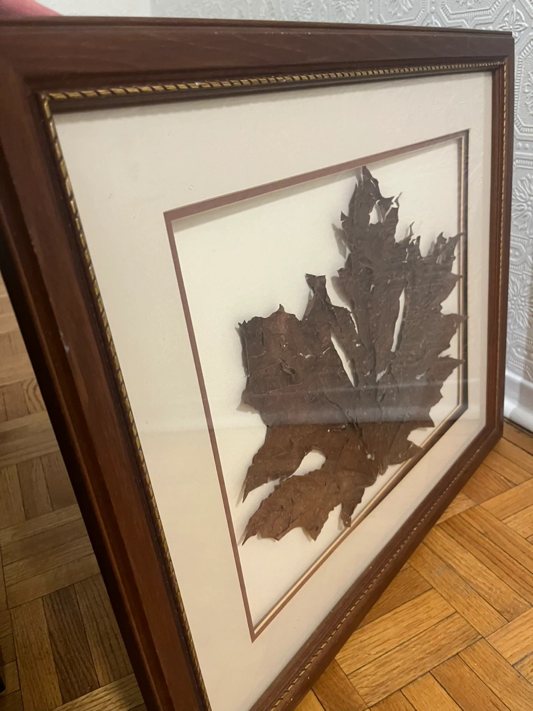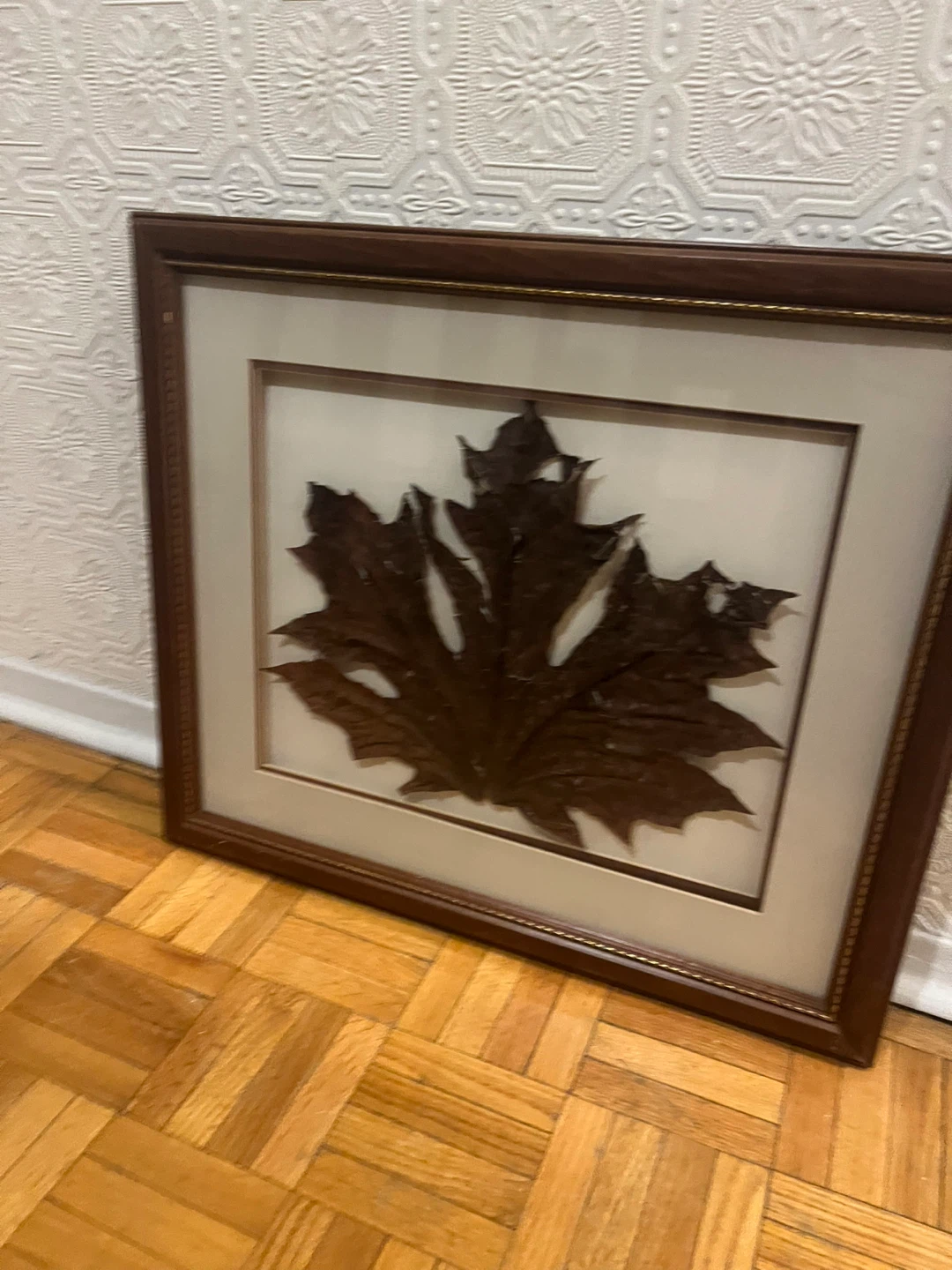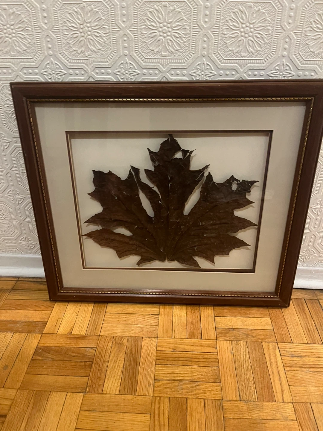 Selling a framed piece of art featuring a maple leaf. It's a unique piece that could add a touch of Canadian charm to any room!