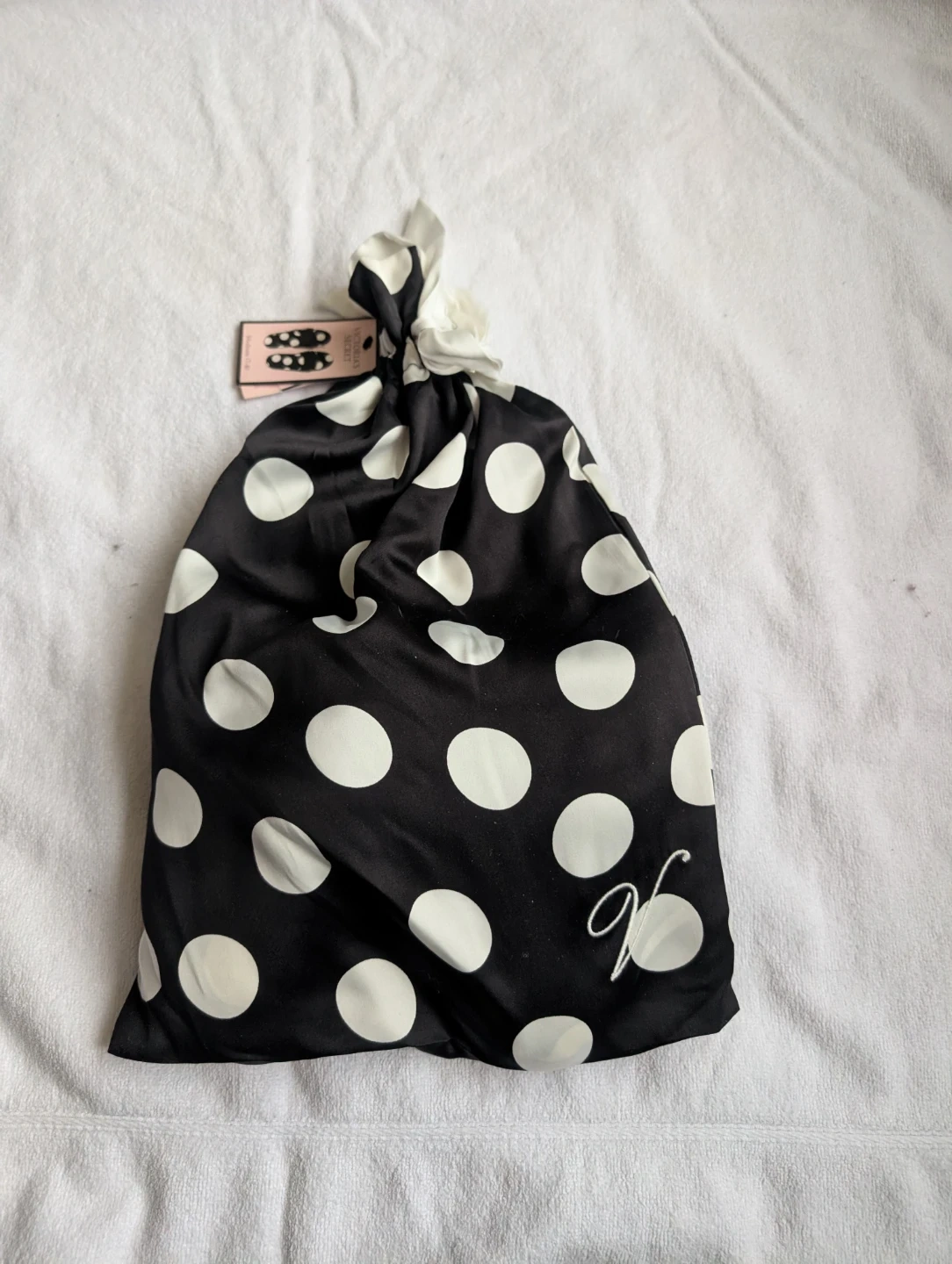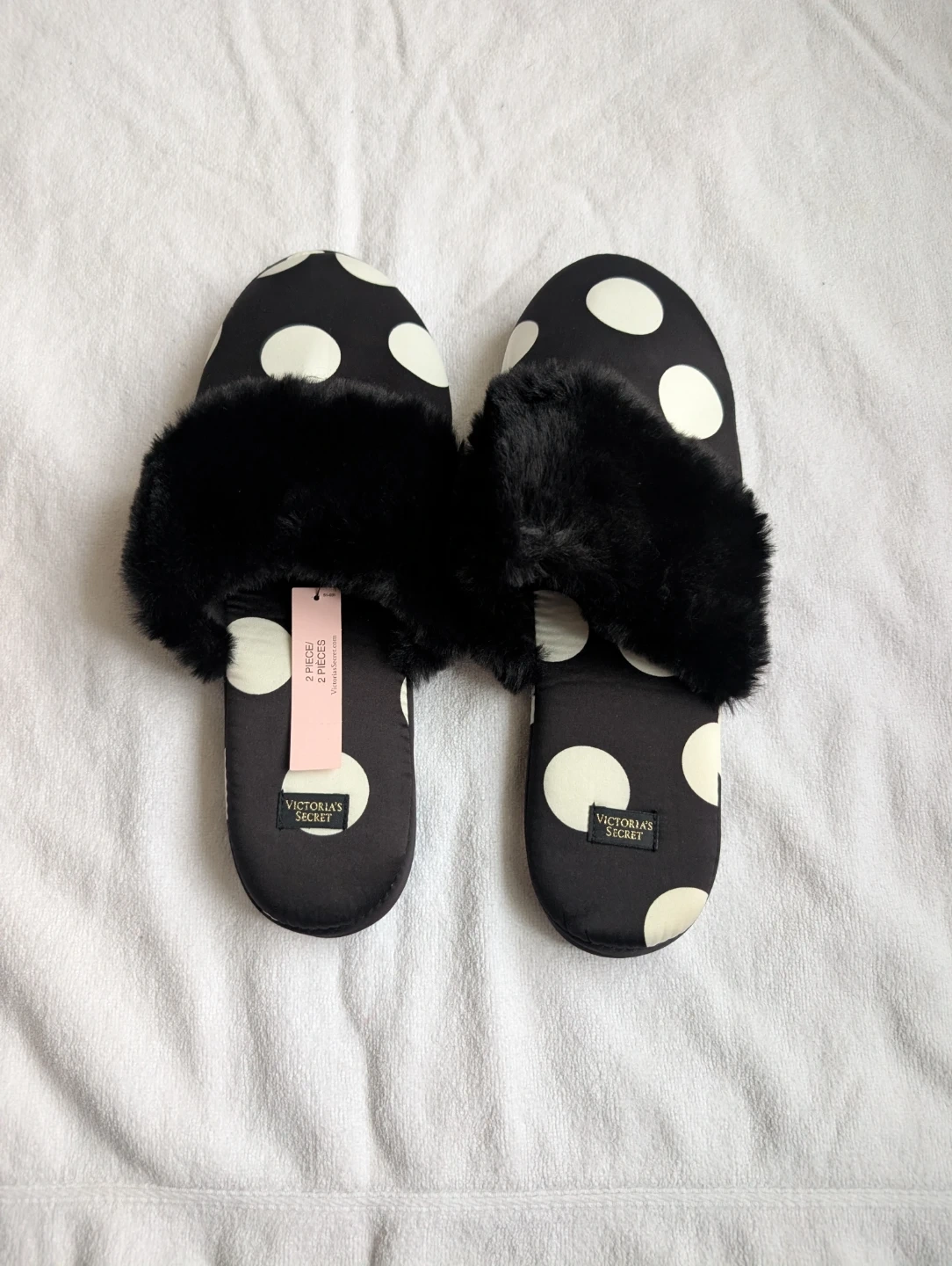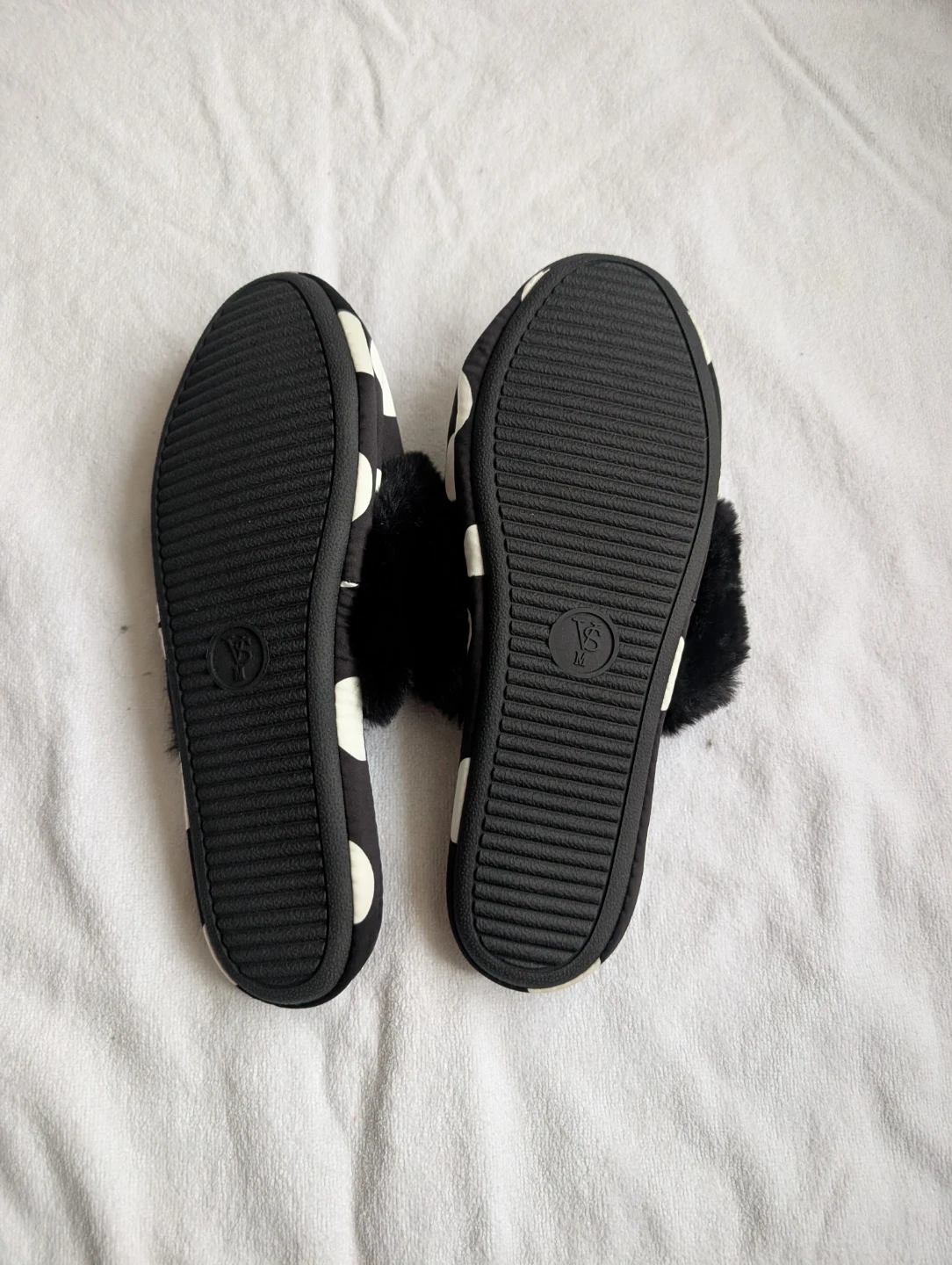 Step into ultimate comfort with these brand-new Victoria's Secret black and white polka dot slippers, size M (7-8), complete with their original satin drawstring bag! These luxurious slippers are the perfect treat for your feet after a long day.