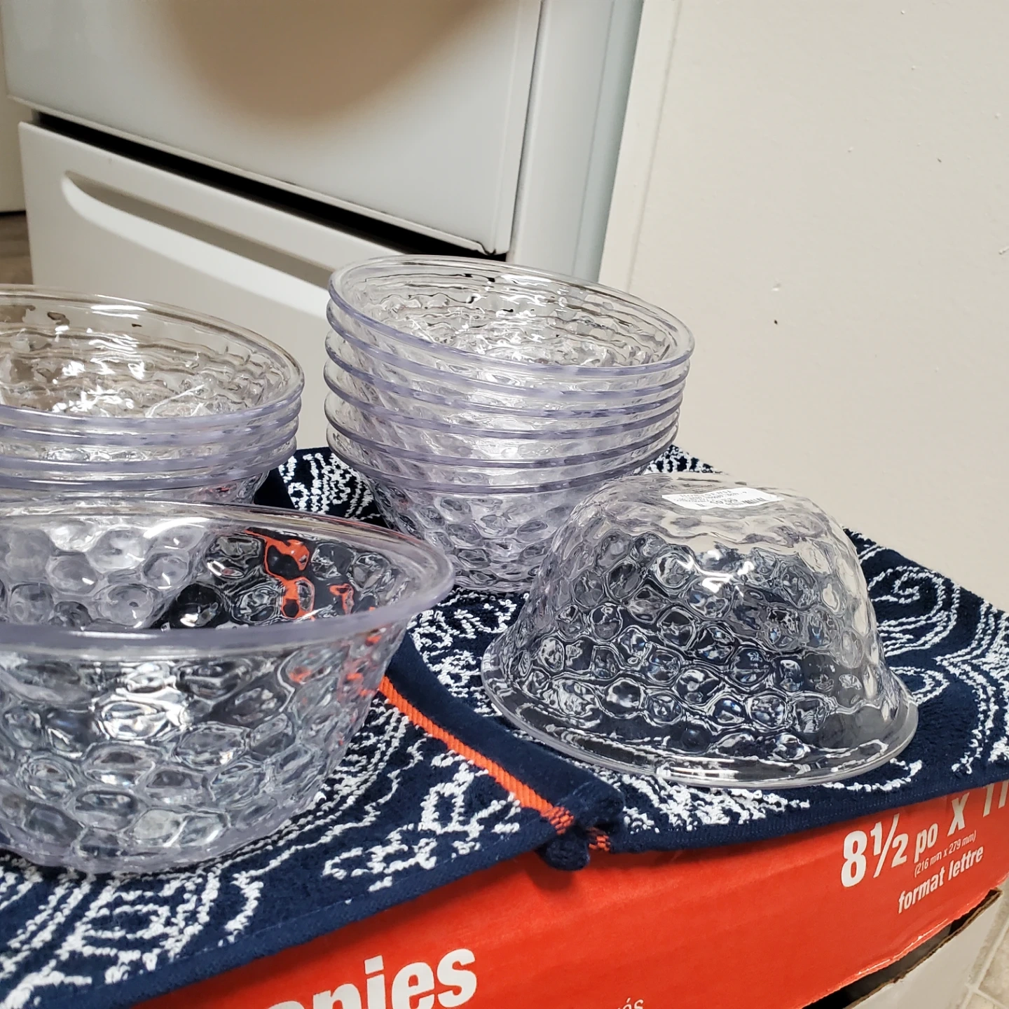 Selling a set of 12 clear bubble bowls from HomeSense. These are dishwasher safe (top rack only). The sticker says they were originally $9.99. Great for snacks or desserts!