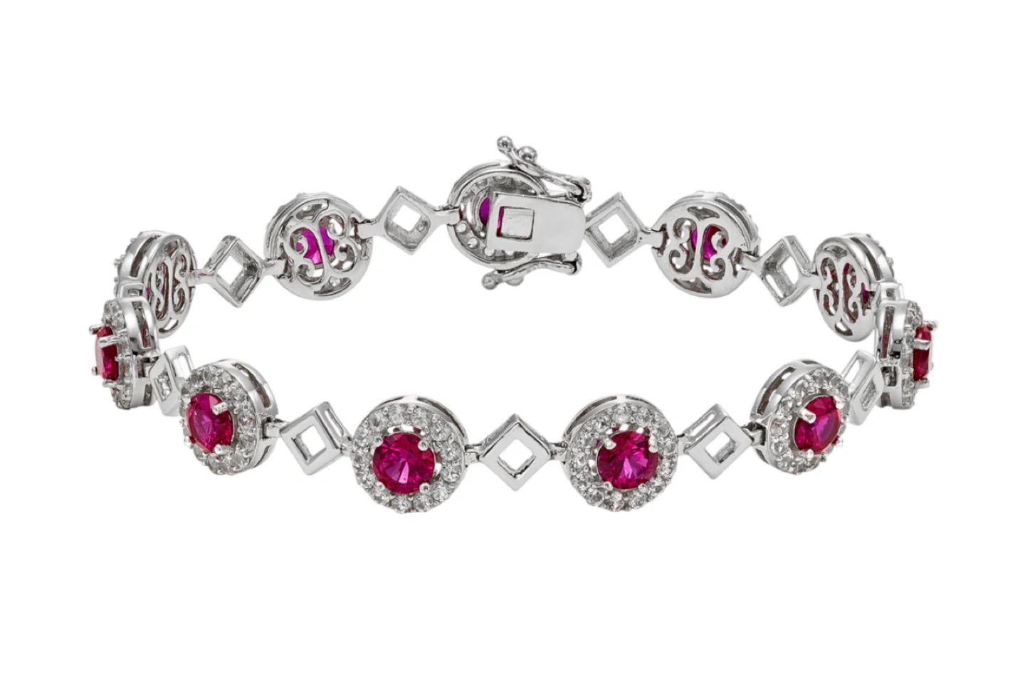 With prominent lab-created rubies surrounded by lab-created white sapphires in a halo design, this sterling silver bracelet dresses up your ensemble with understated elegance.