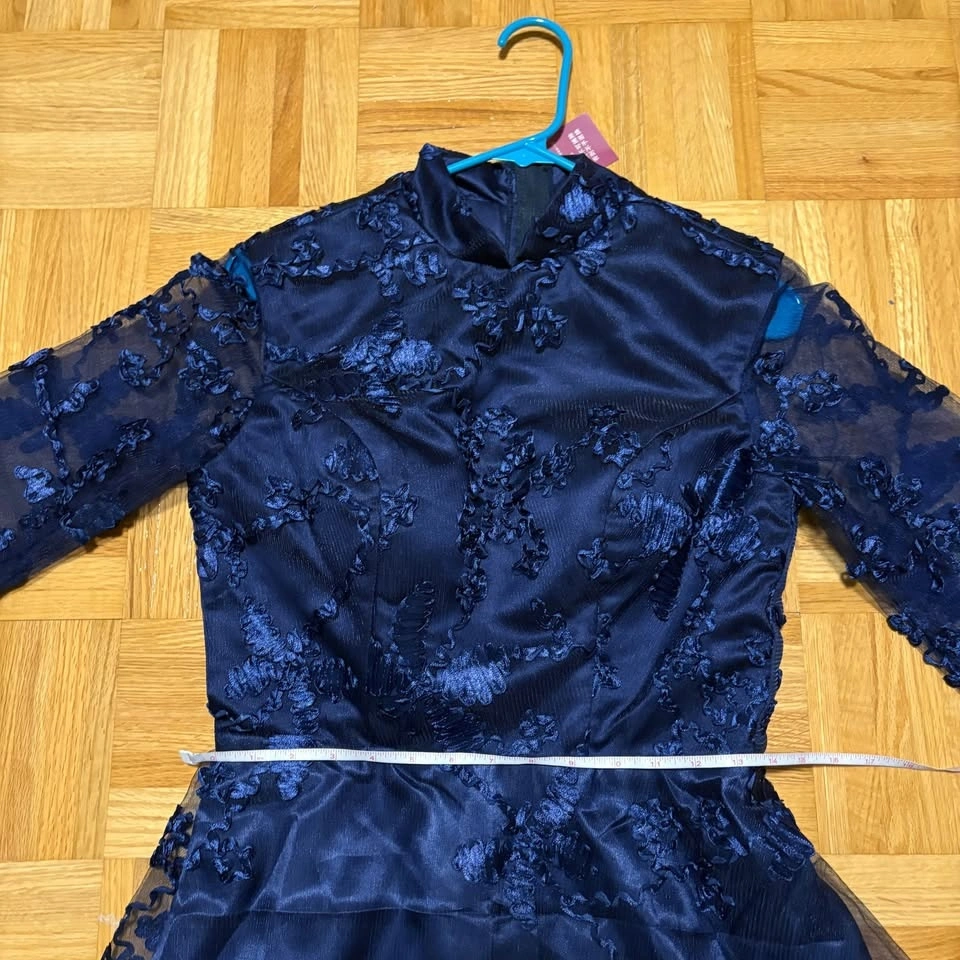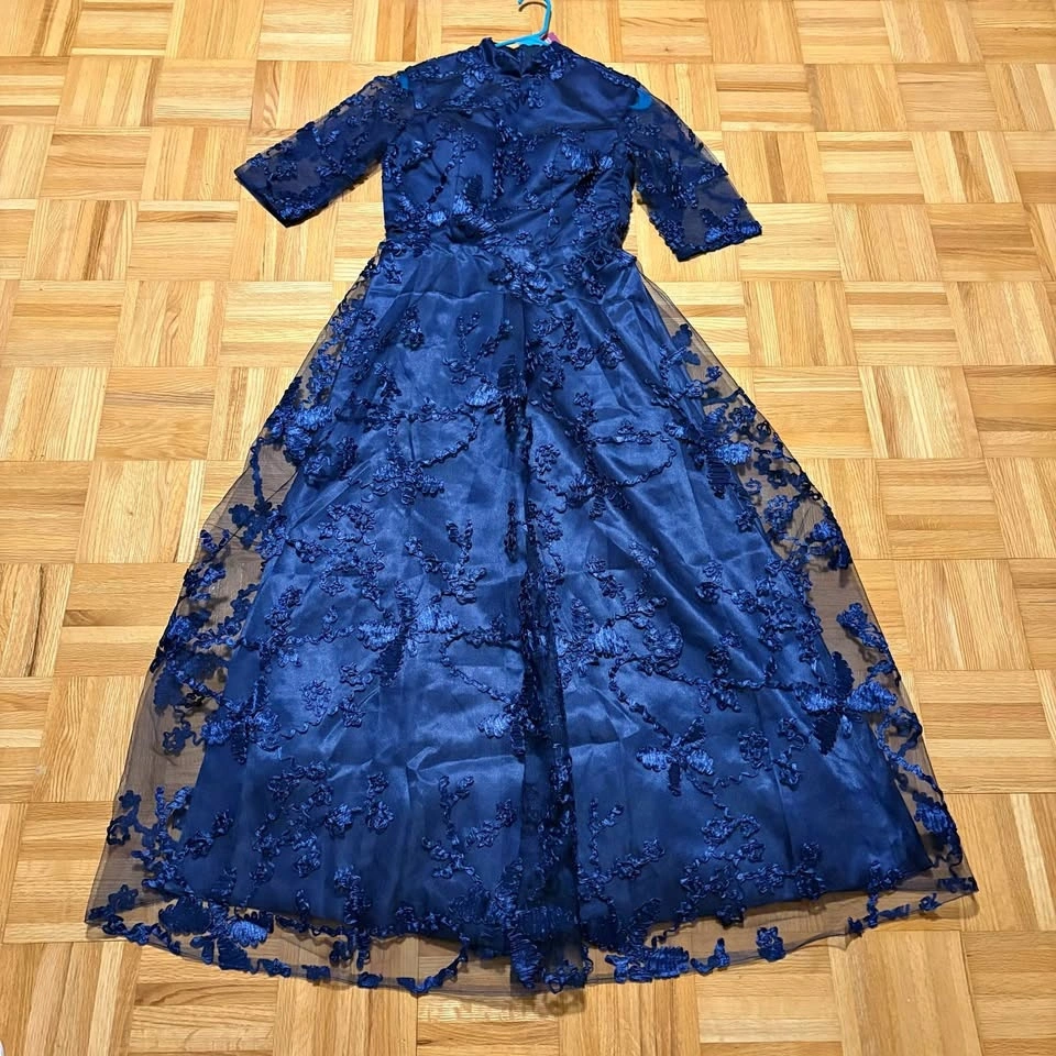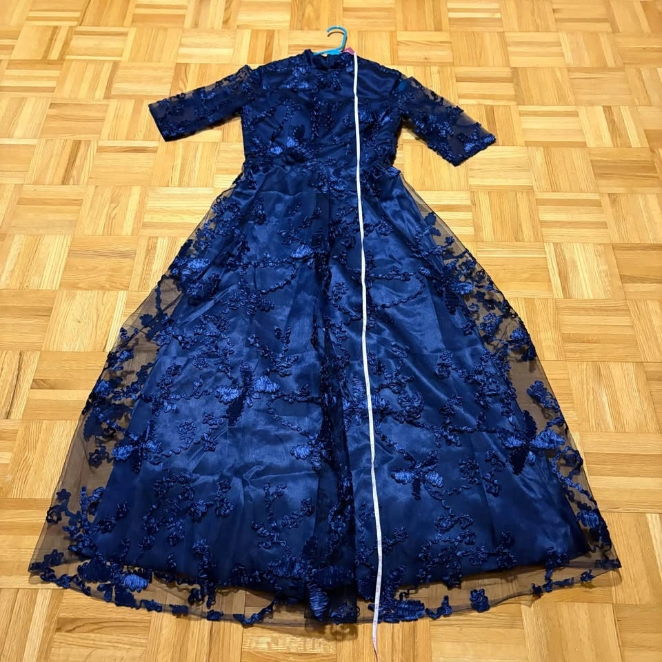 This elegant dress features a beautiful blue color with intricate floral detailing. Perfect for special occasions and performances, it offers both style and comfort.