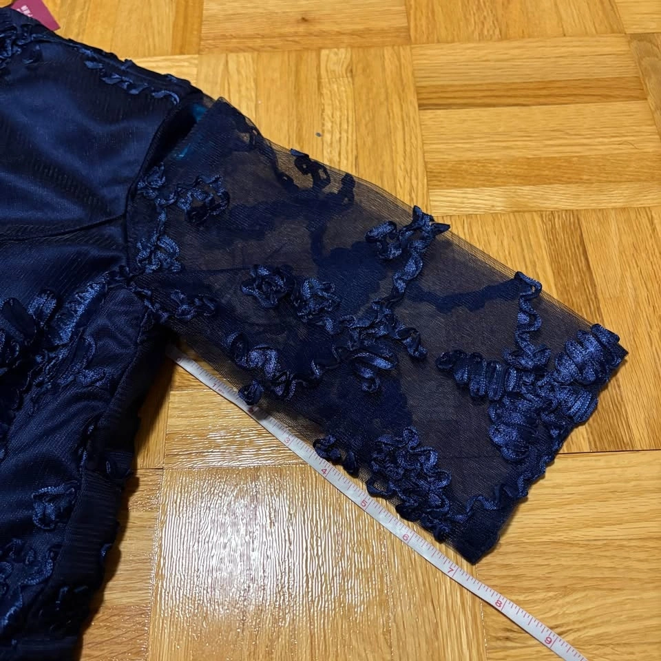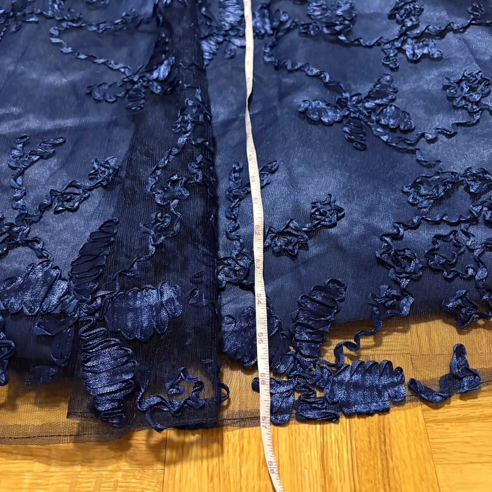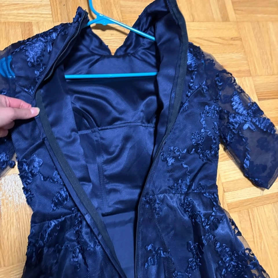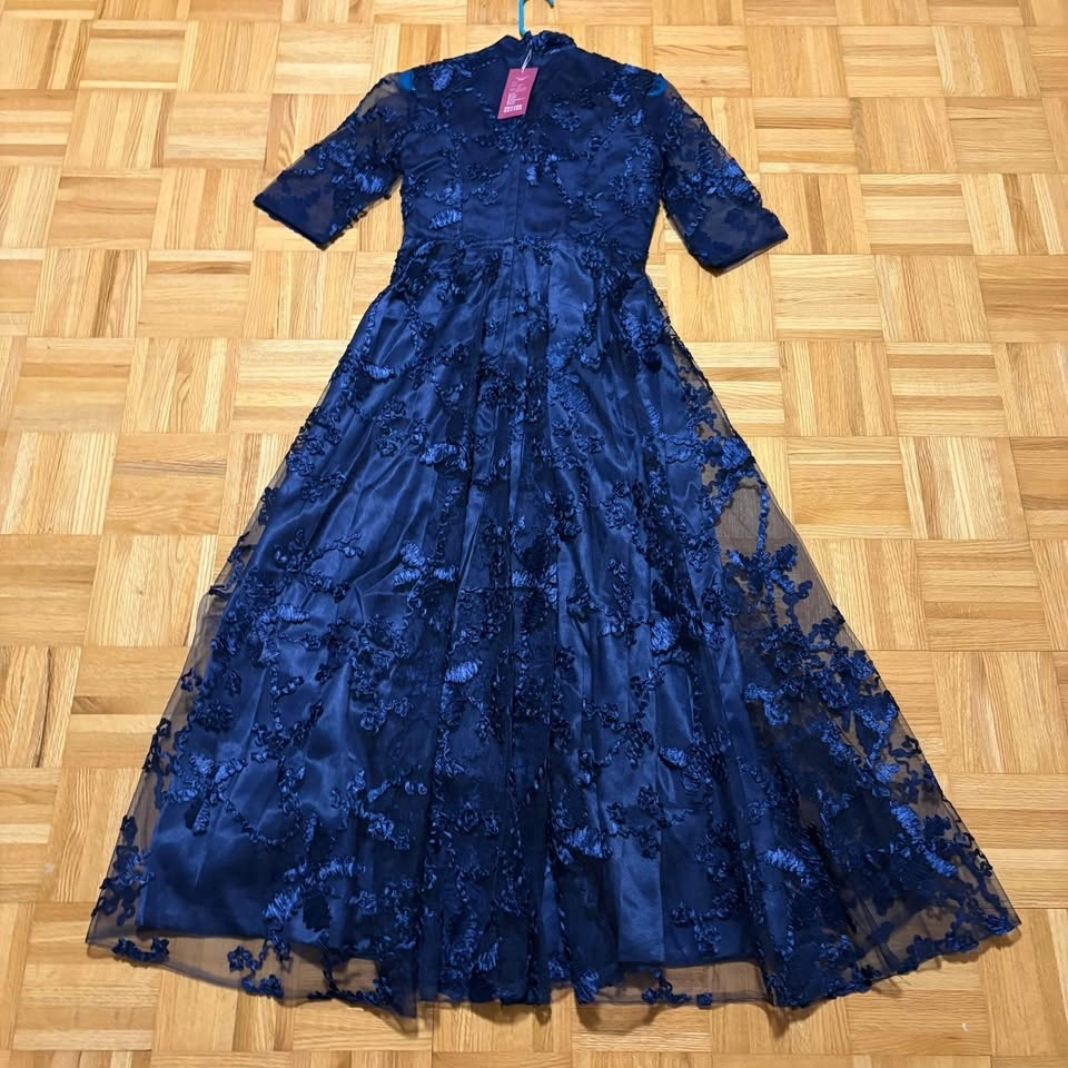This elegant dress features a beautiful blue color with intricate floral detailing. Perfect for special occasions and performances, it offers both style and comfort.