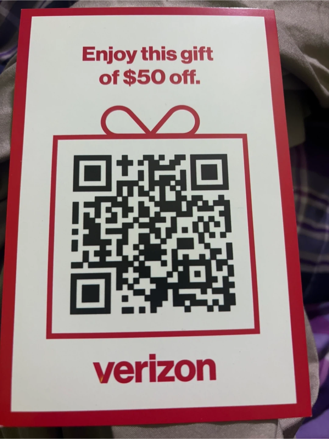 Selling a Verizon $50 gift card. Enjoy this gift! I got this at a event . I'm not a Verzion customer. The First person who scans the code and can use this, let me know so I can mark this " Given Away".