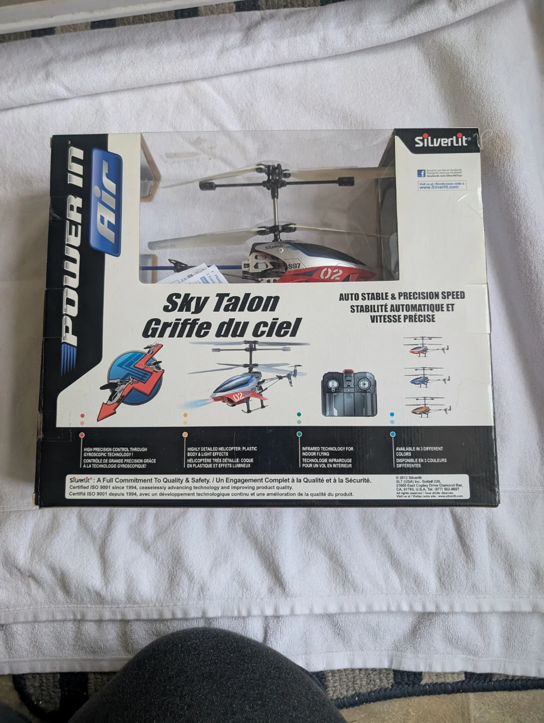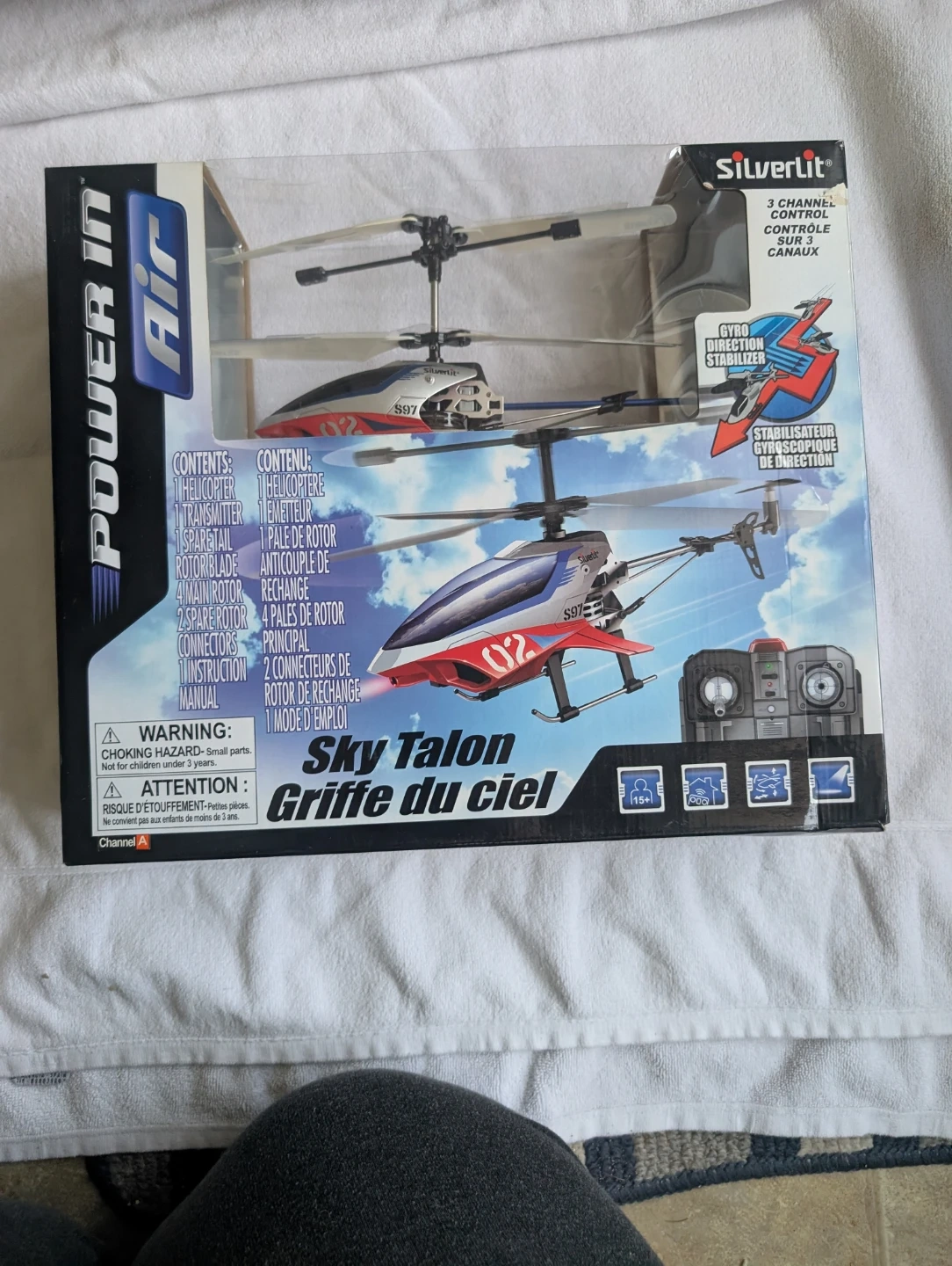 I'm selling a new Silverlit Sky Talon remote-controlled helicopter, perfect for indoor flying! This 3-channel helicopter is designed for stable and precise control. It comes in its original packaging and is ready for its first flight.