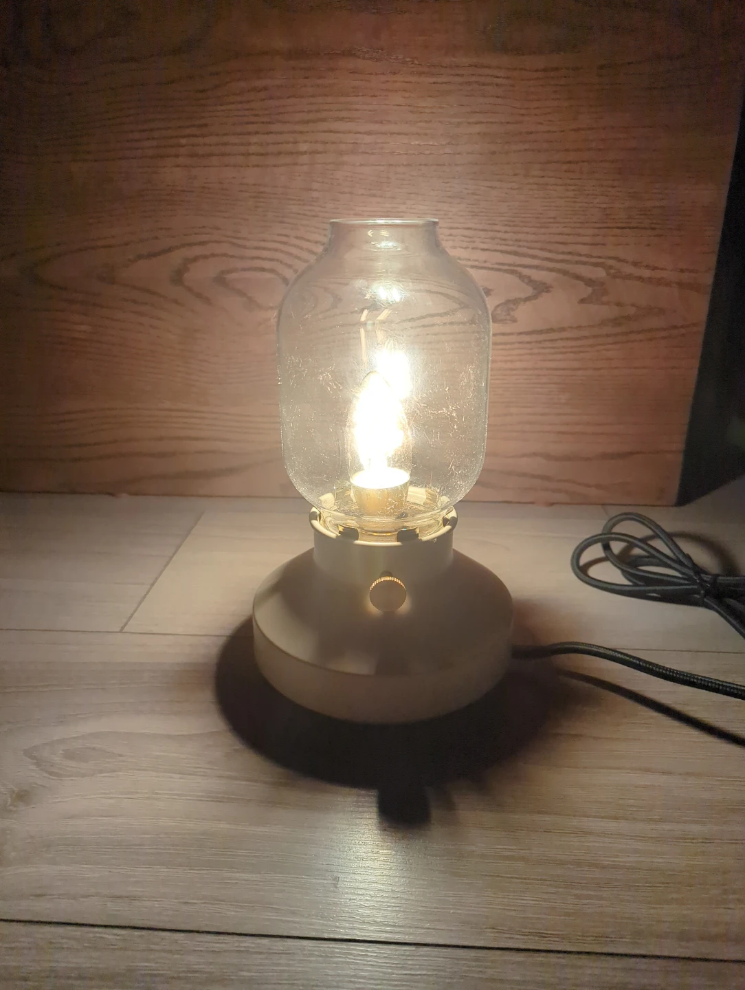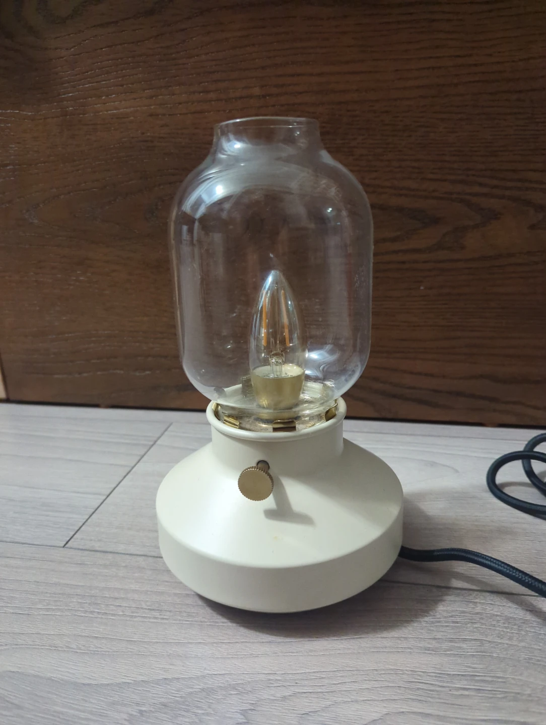 Here's a cute table lamp with a glass shade! It gives off a warm and cozy light, perfect for a bedside table. Light is adjustable.