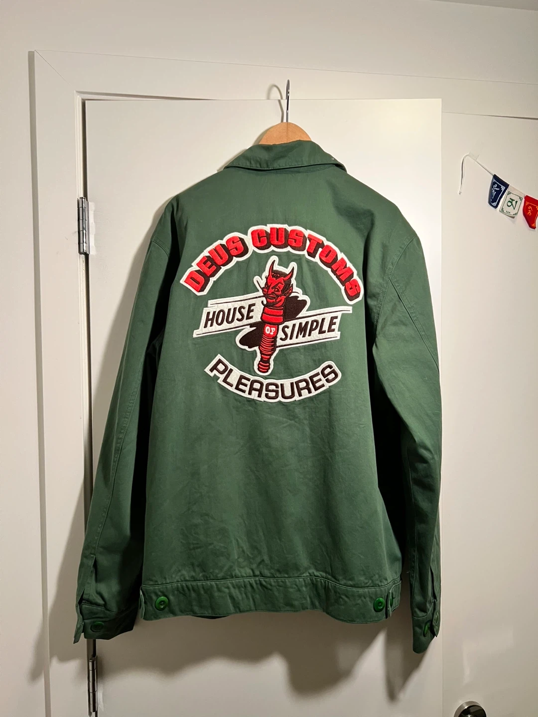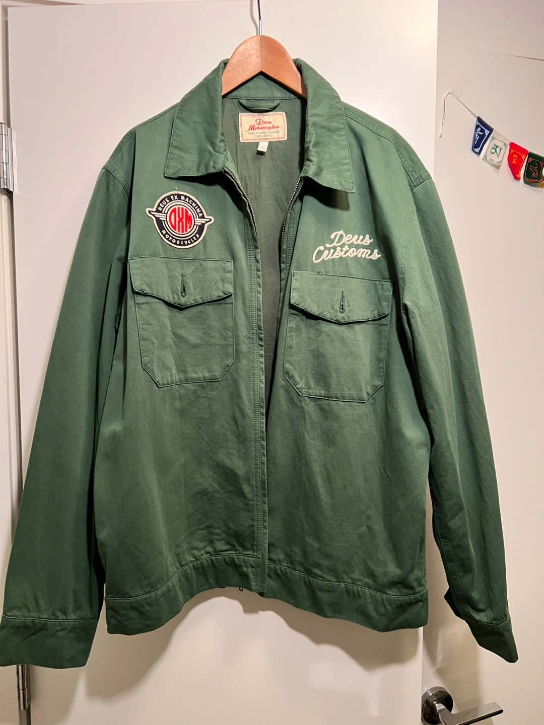 Selling a Deus Ex Machina jacket in a nice green colour. It's a zip-up jacket with pockets on the front. The back has a cool Deus Customs graphic. Perfect for adding a bit of style to your wardrobe!