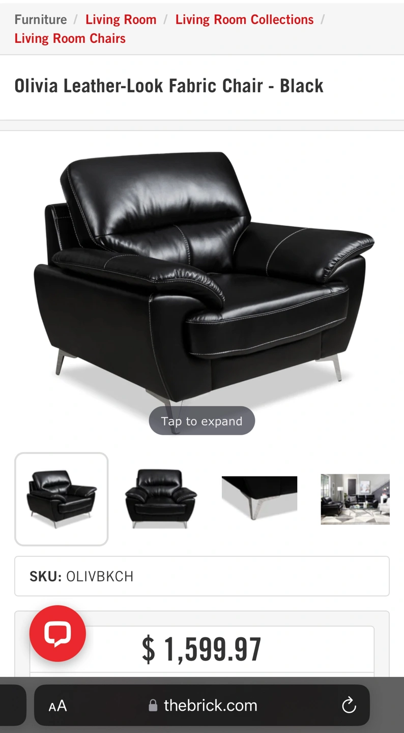 “High-density foam cushions, which are wrapped in fibre batting for an extra-plush look, offer a comfortable place for you and your family to relax. Rest easy knowing your Olivia chair will never feel too hot or too cold with breathable, leather-look fabric covering this piece”