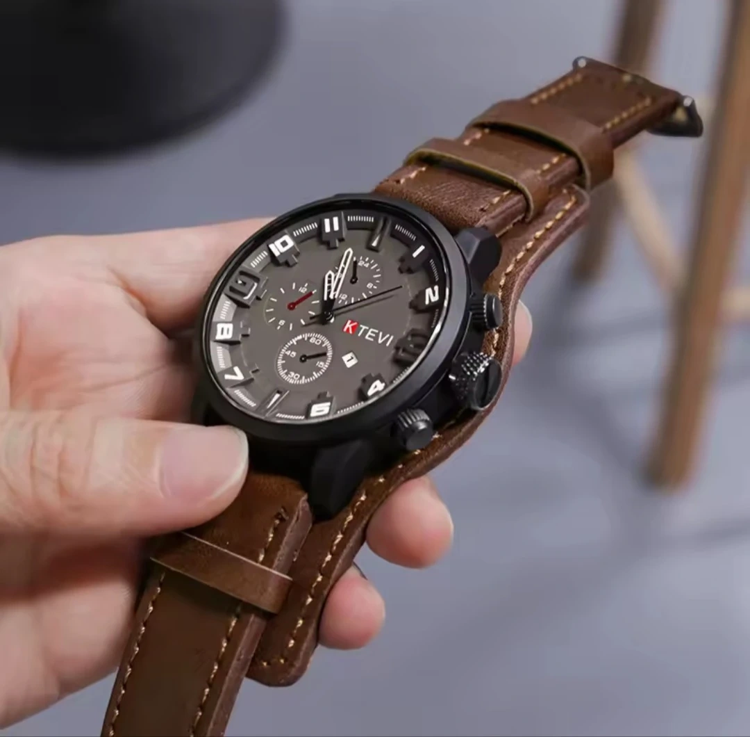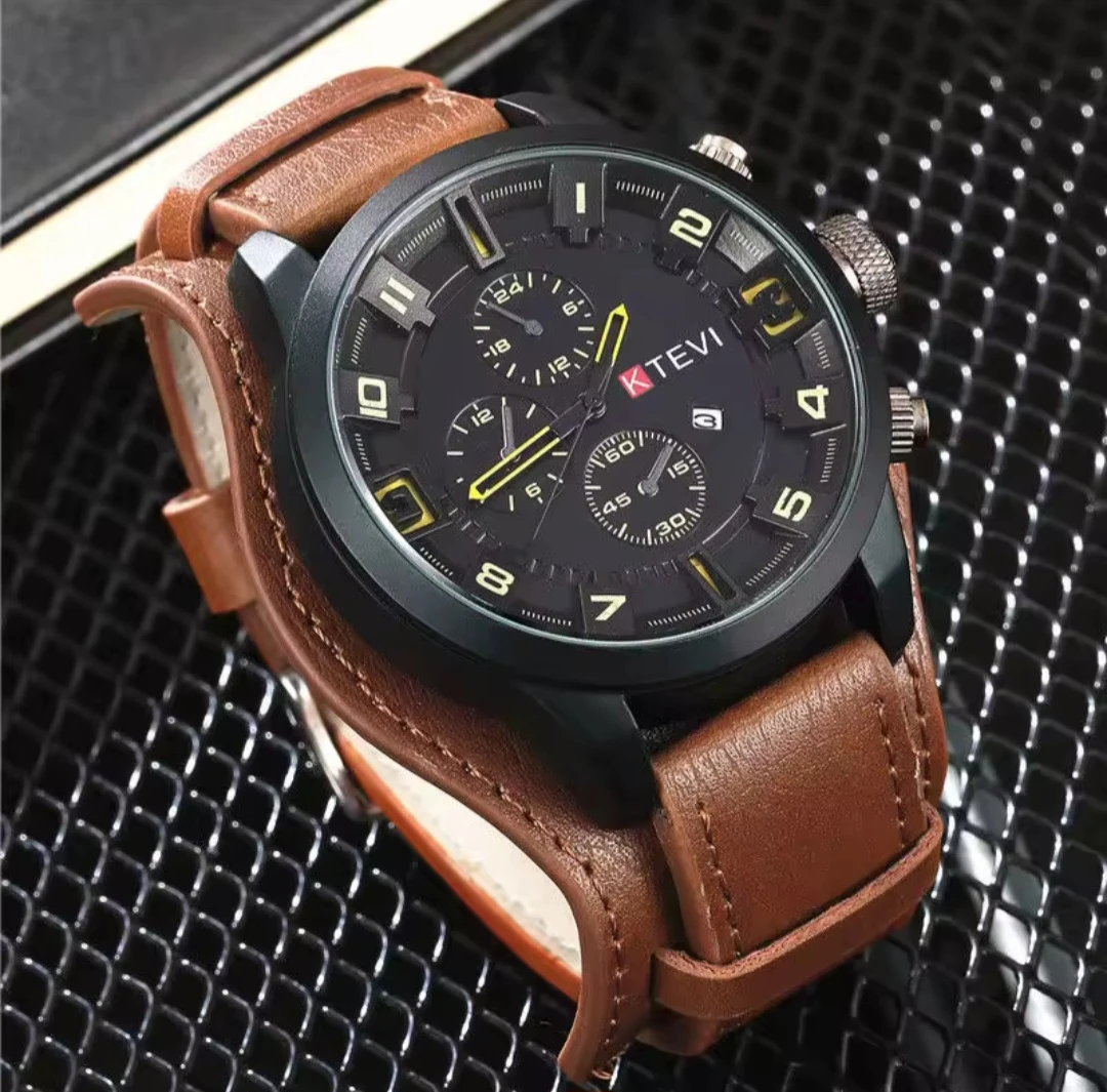 Check out this KTEVI watch with a stylish brown leather band! The watch face features a black dial with contrasting numerals and hands. It's a great looking watch!
