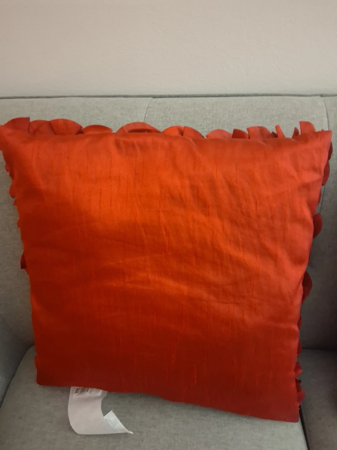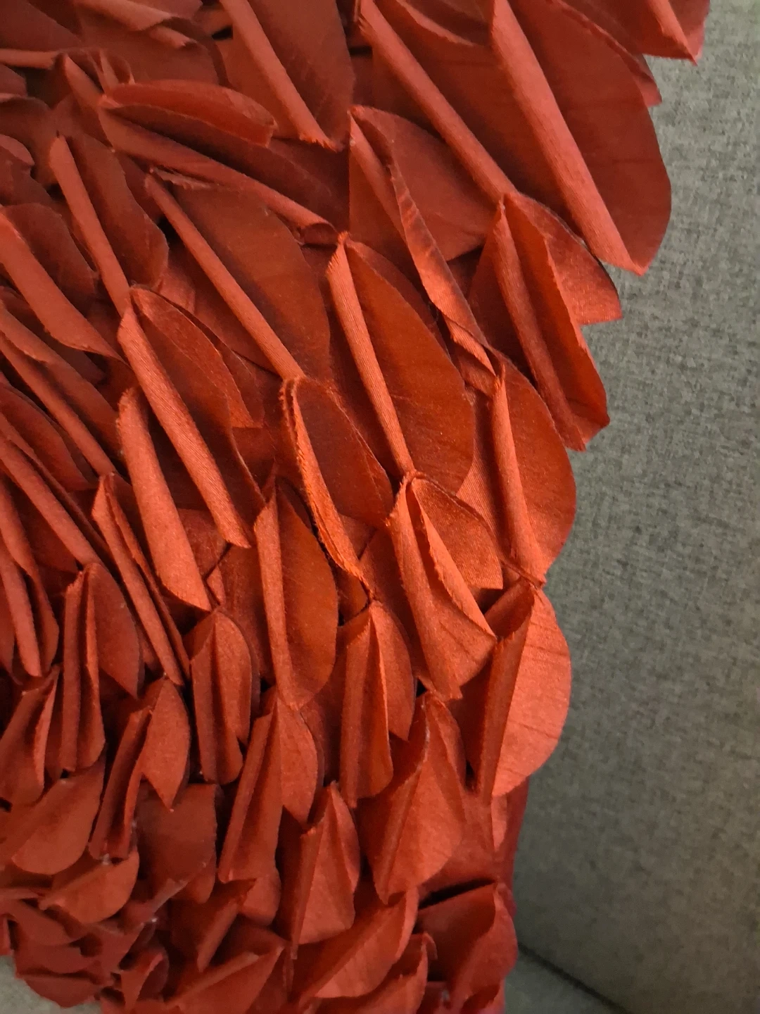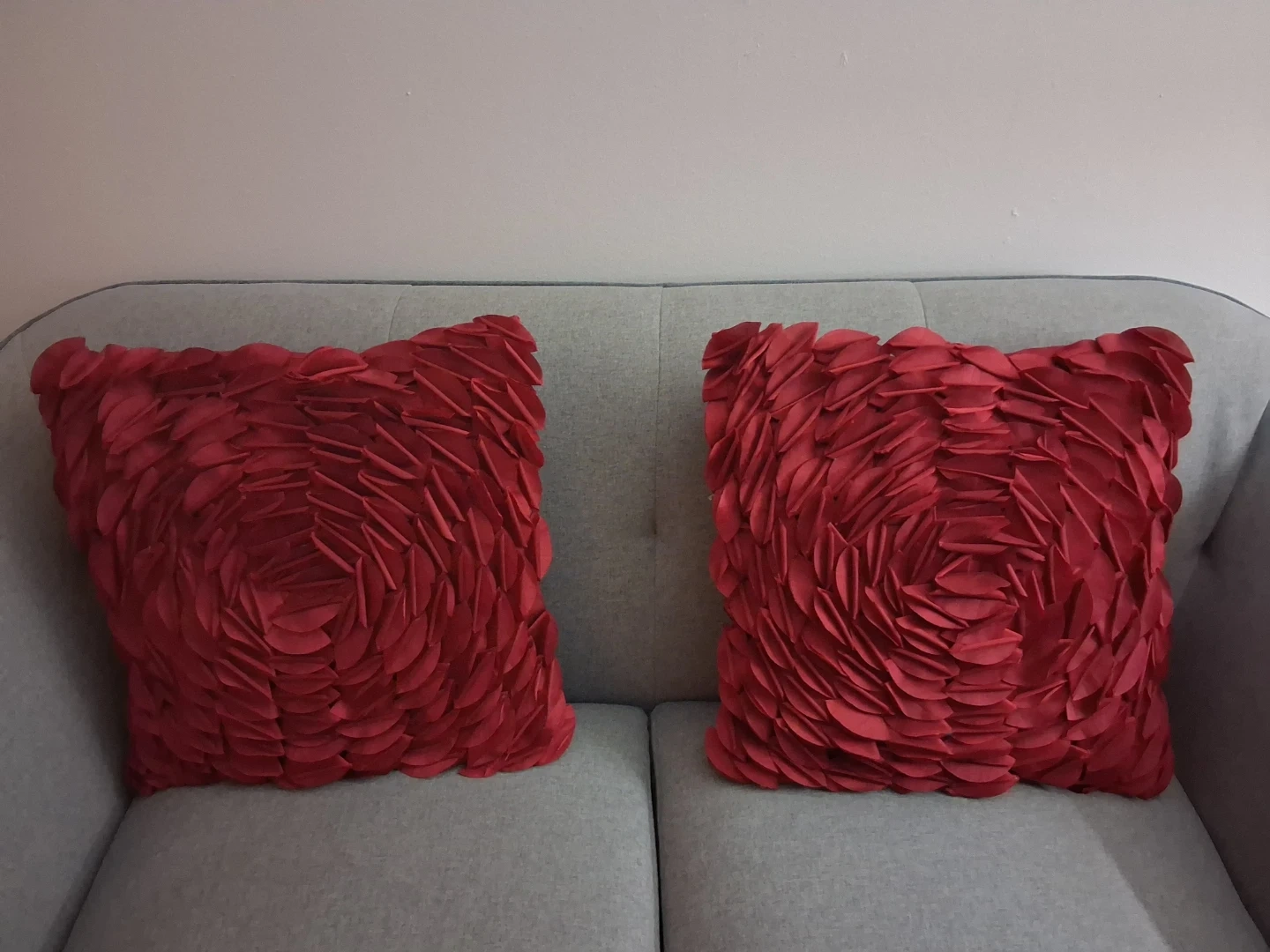 Pair of 2. Here's a decorative throw pillow in a vibrant red colour. It has a unique design with petal-like accents. Perfect for adding a pop of colour and texture to your living space!