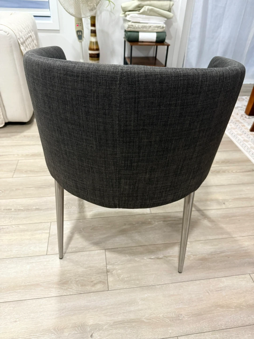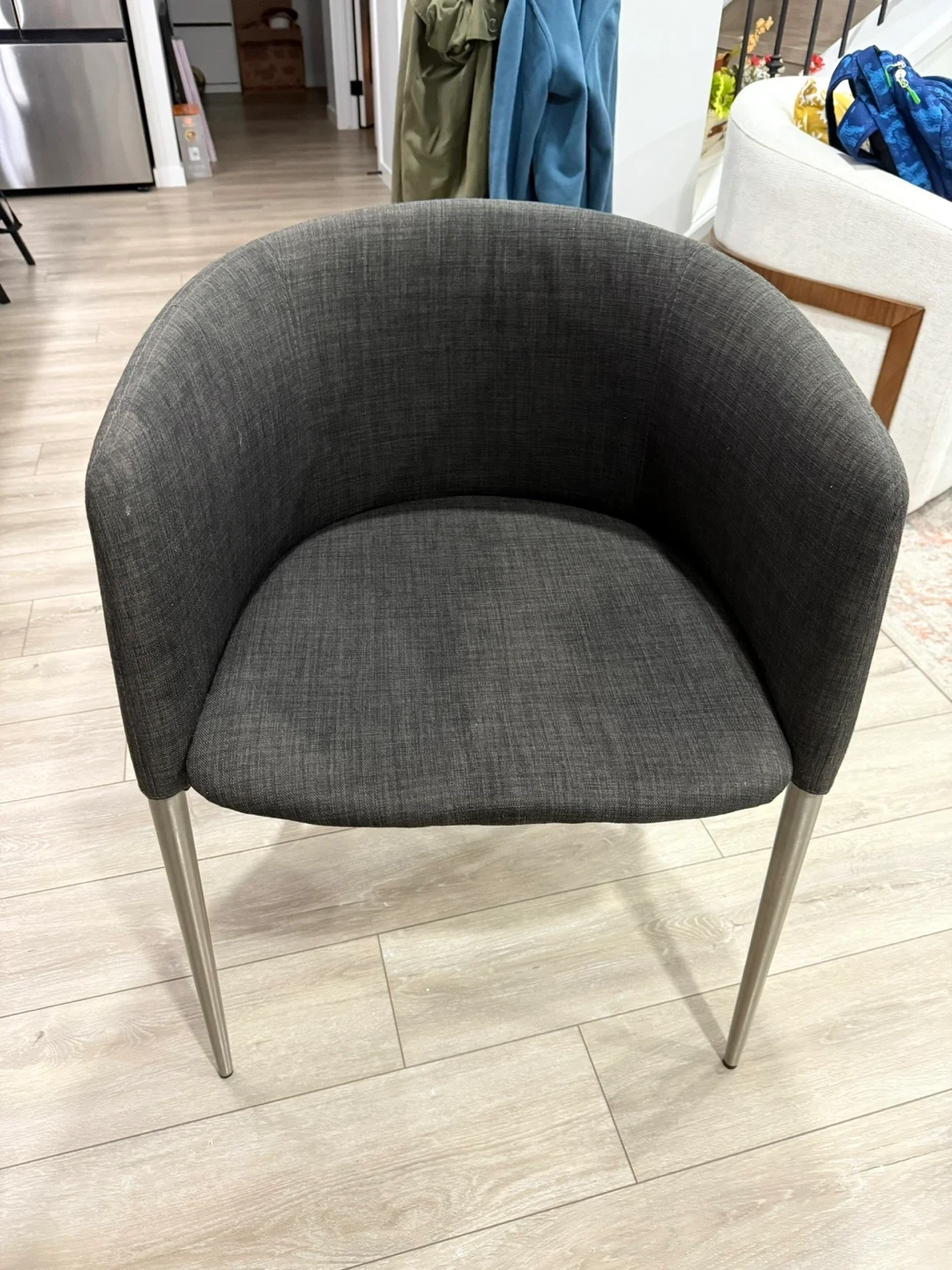 Selling a stylish grey accent chair! It's in great condition and would look lovely in any living space or bedroom. The chair features a curved back and sleek metal legs. It's comfortable and sturdy, perfect for adding a touch of modern elegance to your home