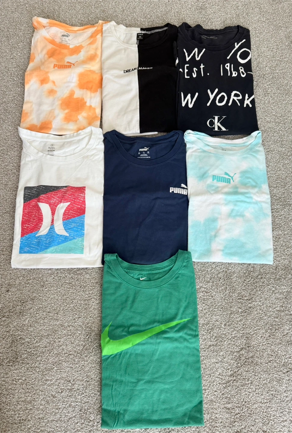 Selling a bundle of assorted t-shirts in size XXL. Brands include Puma, Nike, Hurley, Calvin Klein, and Shein. Great for casual wear!