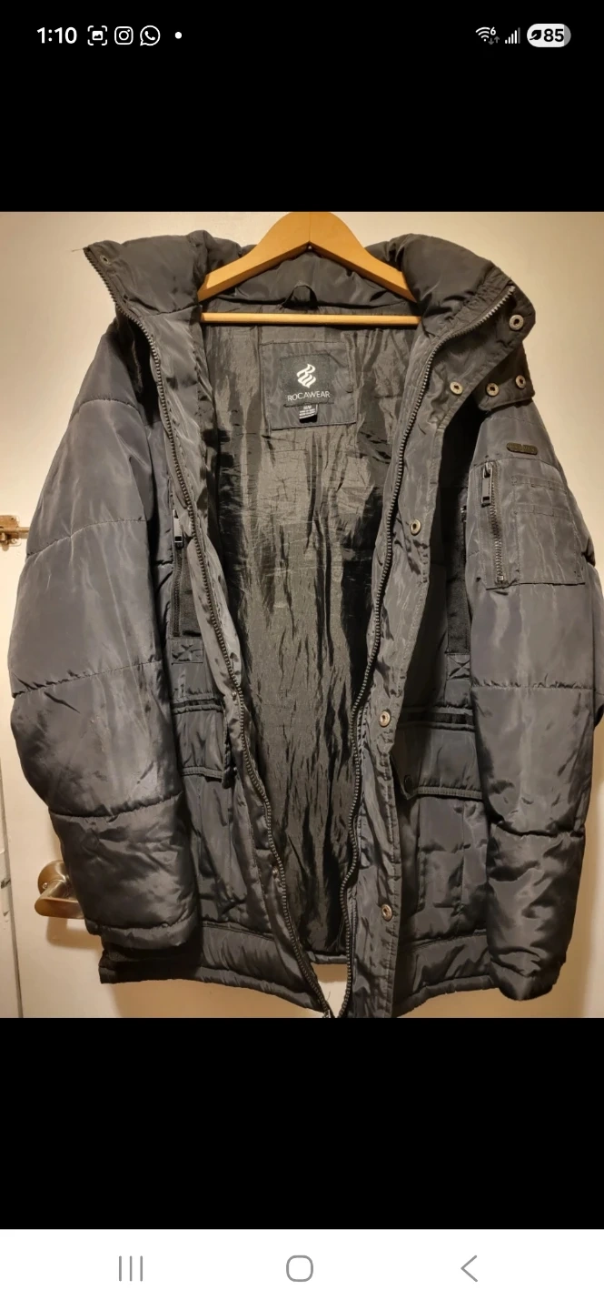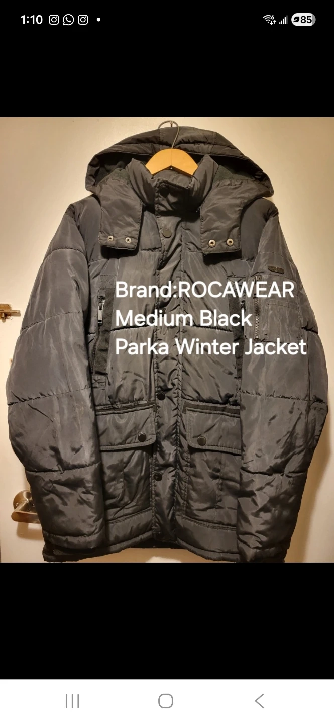 Men's ROCAWEAR medium black winter parka. Features a hood, multiple pockets, and zipper closure.