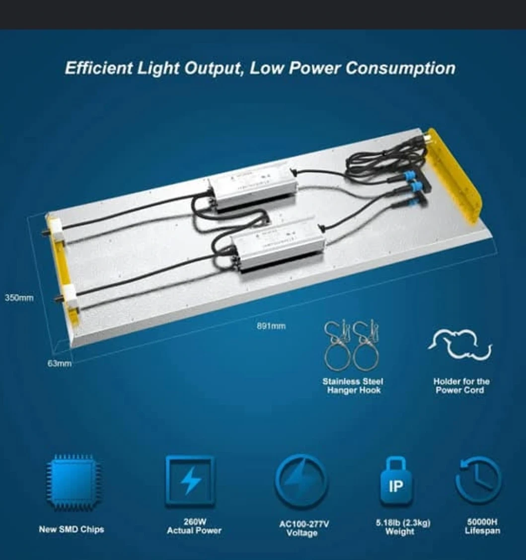 ****LOW ENERGY CONSUMPTION - TMLAPY H260 led grow light equipped with newest high efficient LM301B LED, to increase efficiency and lifespan while improving light penetration. Consuming only 260 watt true output! It saves up to 80% energy than other led grow lights. The best hanging height VEG: 16", BLOOM: 16" ,VEG+BLOOM On: 24". The max coverage area is VEG: 4*5.3ft, BLOOM: 4*5.3ft ,VEG+BLOOM On: 6.6.