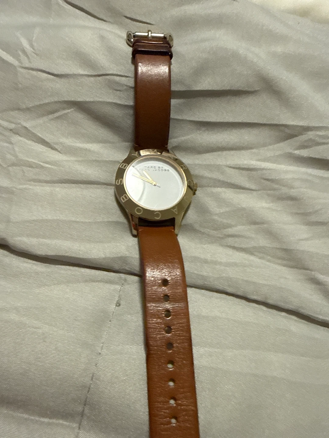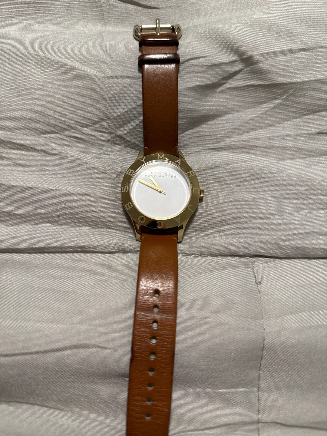 Selling a Marc by Marc Jacobs watch with a brown leather strap and gold-tone bezel. It's in good condition and has a clean, minimalist design