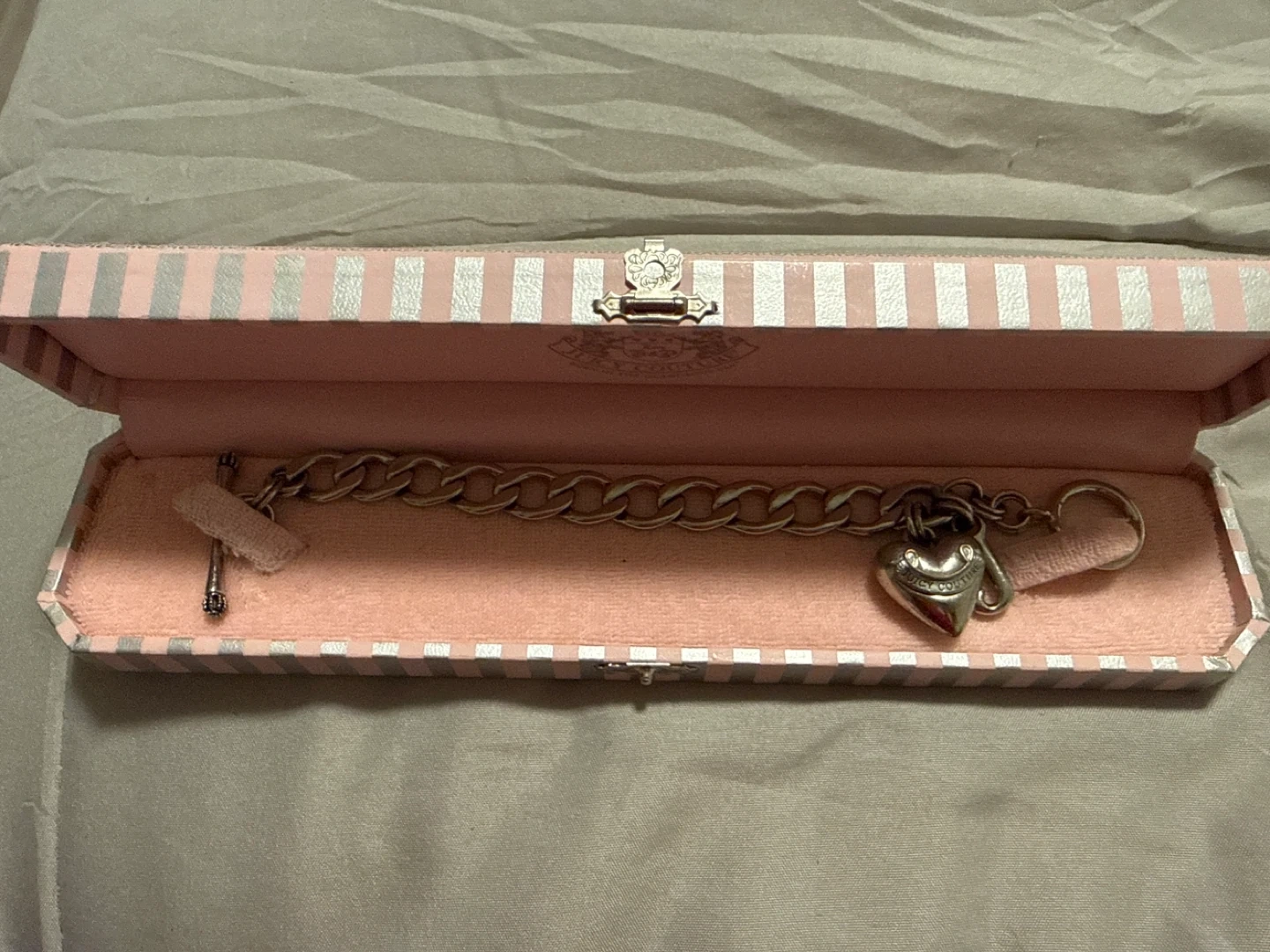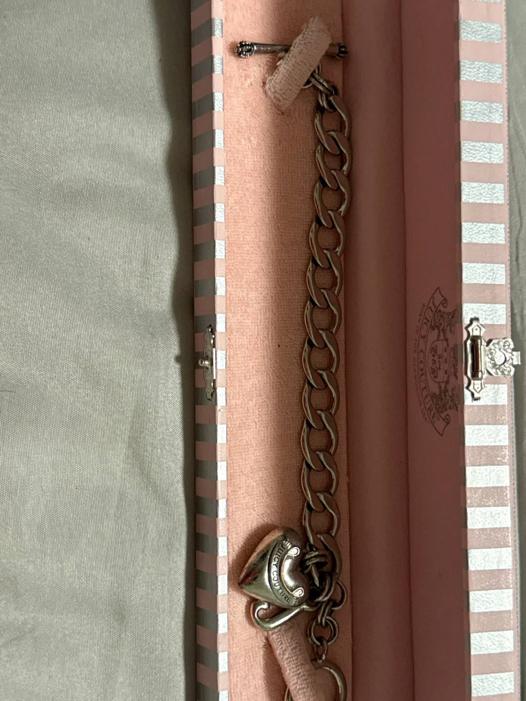 Selling a Juicy Couture charm bracelet that comes with its original box. It features a heart-shaped charm and a classic chain design. Perfect for adding a touch of Y2K nostalgia to your style!