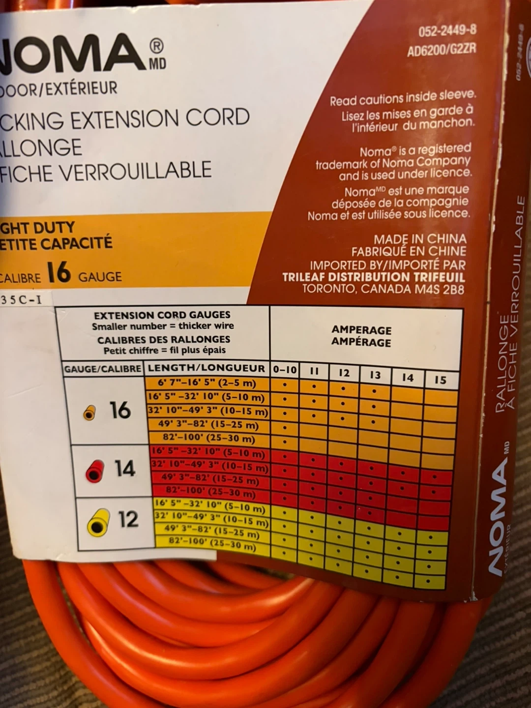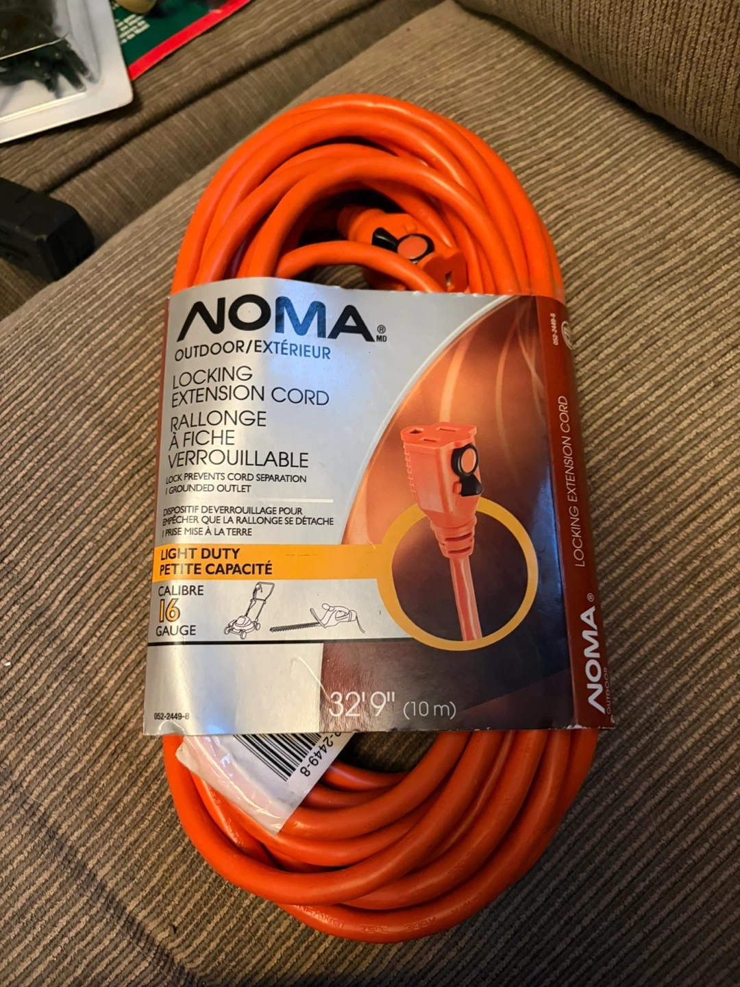 Selling a NOMA outdoor/exterior locking extension cord. It's a light duty, 16 gauge cord that is 32'9" (10m) in length. Great for preventing cord separation from grounded outlets!