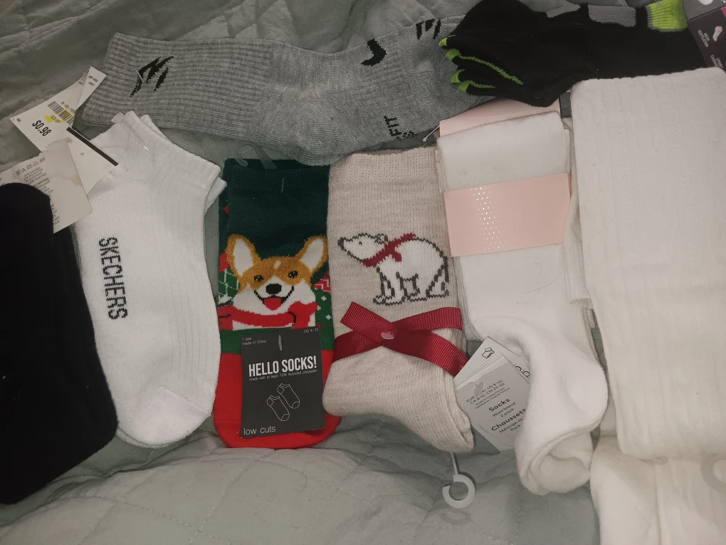 Selling a collection of assorted socks featuring brands like Nike, Skechers, and Cupcakes and Cashmere! There are different colors and designs, including a cute polar bear. Perfect for everyday wear! Children sizes. Cable tights are children size. 6 pairs. 2 tights. 8 items all together.