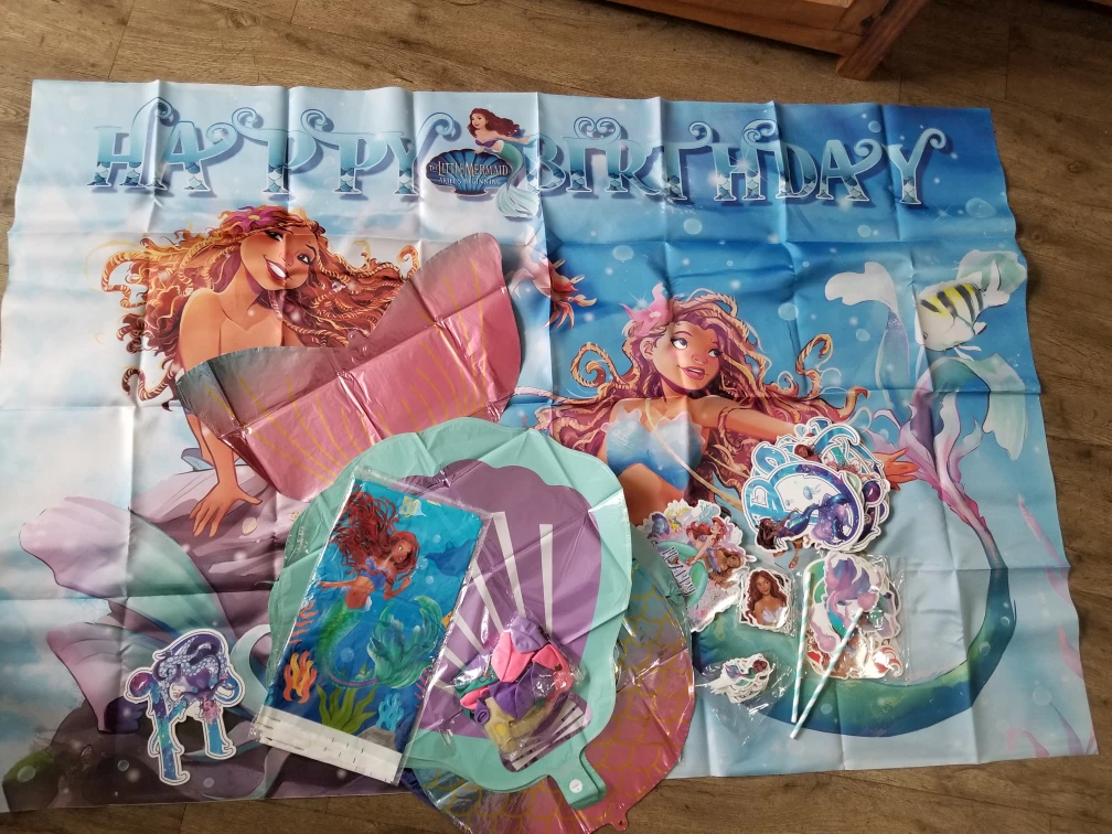 New Little Mermaid themed birthday party decoration set! Includes a backdrop, balloon, and various decorative pieces to make your little one's birthday extra special.