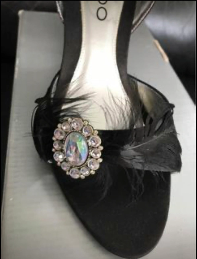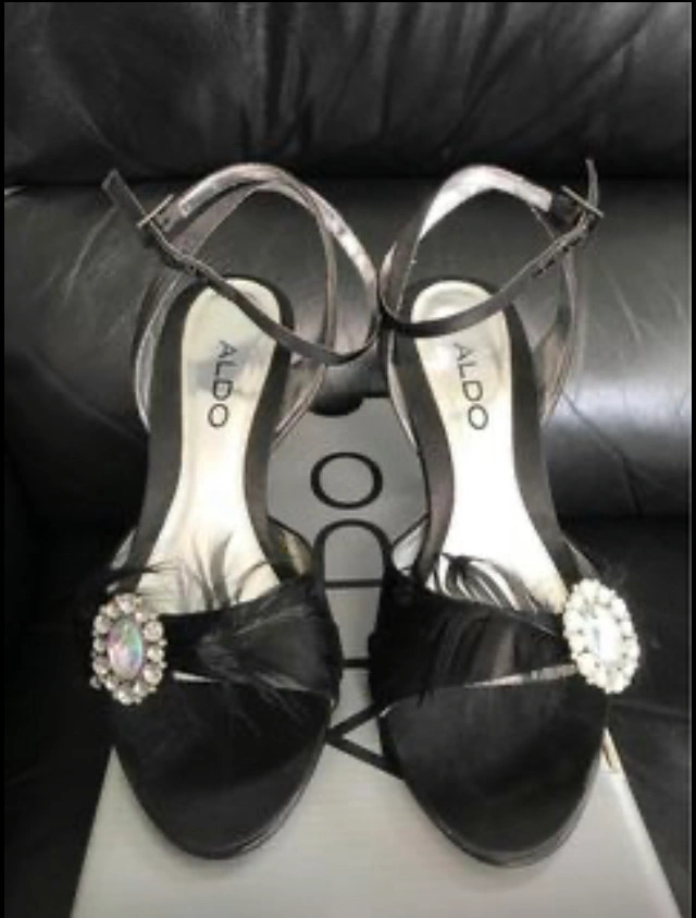 ALDO Black Satin heels with one crystal on it is excellent and new. I have never use and untouched it. Size 35 is 5. It would be good for banquets or weddings.