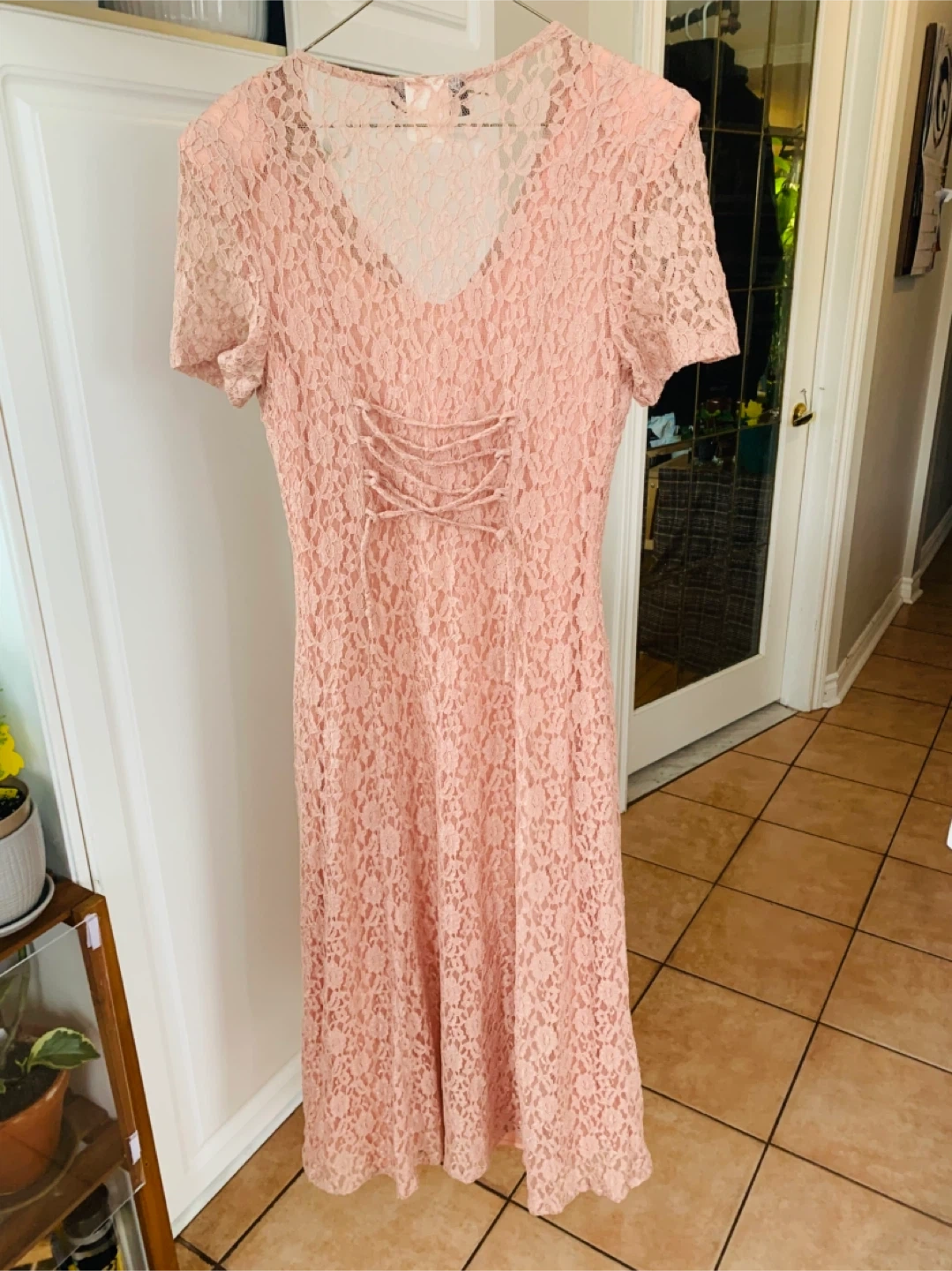 Full-length (long) dress. Size 7. Peach colour with separate inside lining. Selling for $25 CAD firm. Smoke Free Home.