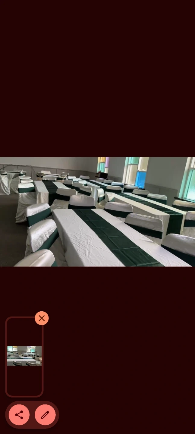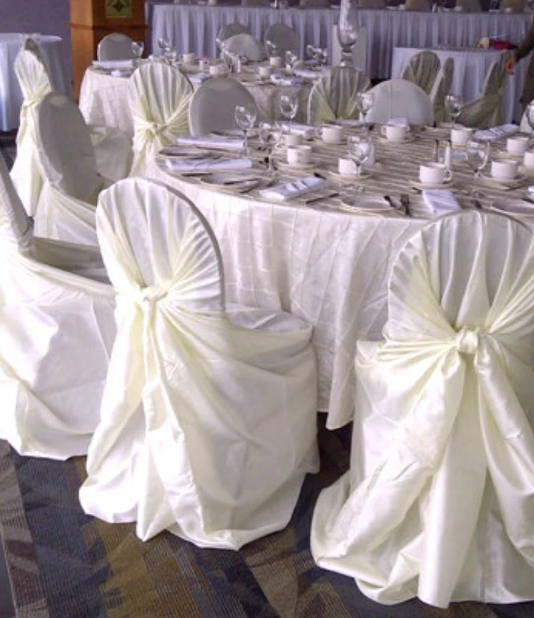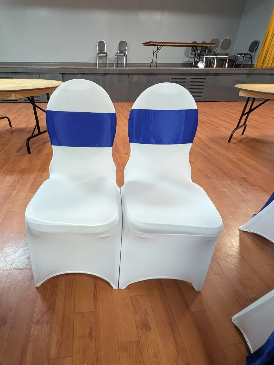 Selling some chair covers! They're white with a blue sash, perfect for events or parties. They look to be in good condition and ready to use for your next gathering