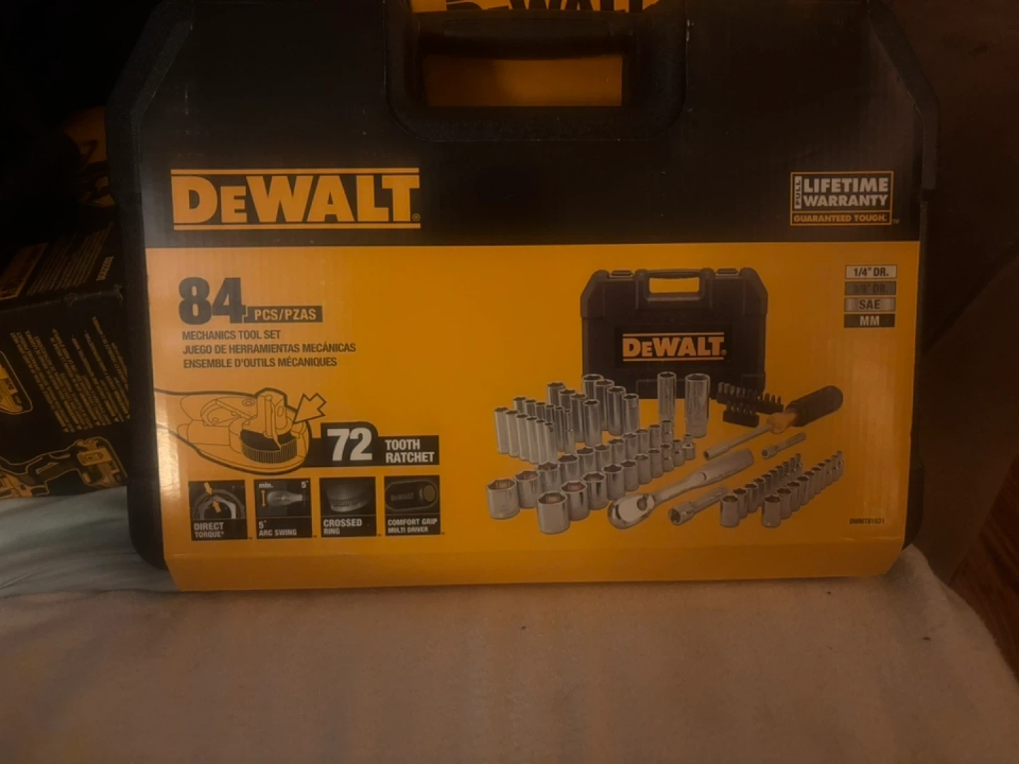 Selling a DeWalt 84-piece mechanics tool set. It includes a 72-tooth ratchet, direct torque, 5-degree arc swing, and a comfort grip multi-driver. The set comes in a case and has a lifetime warranty!