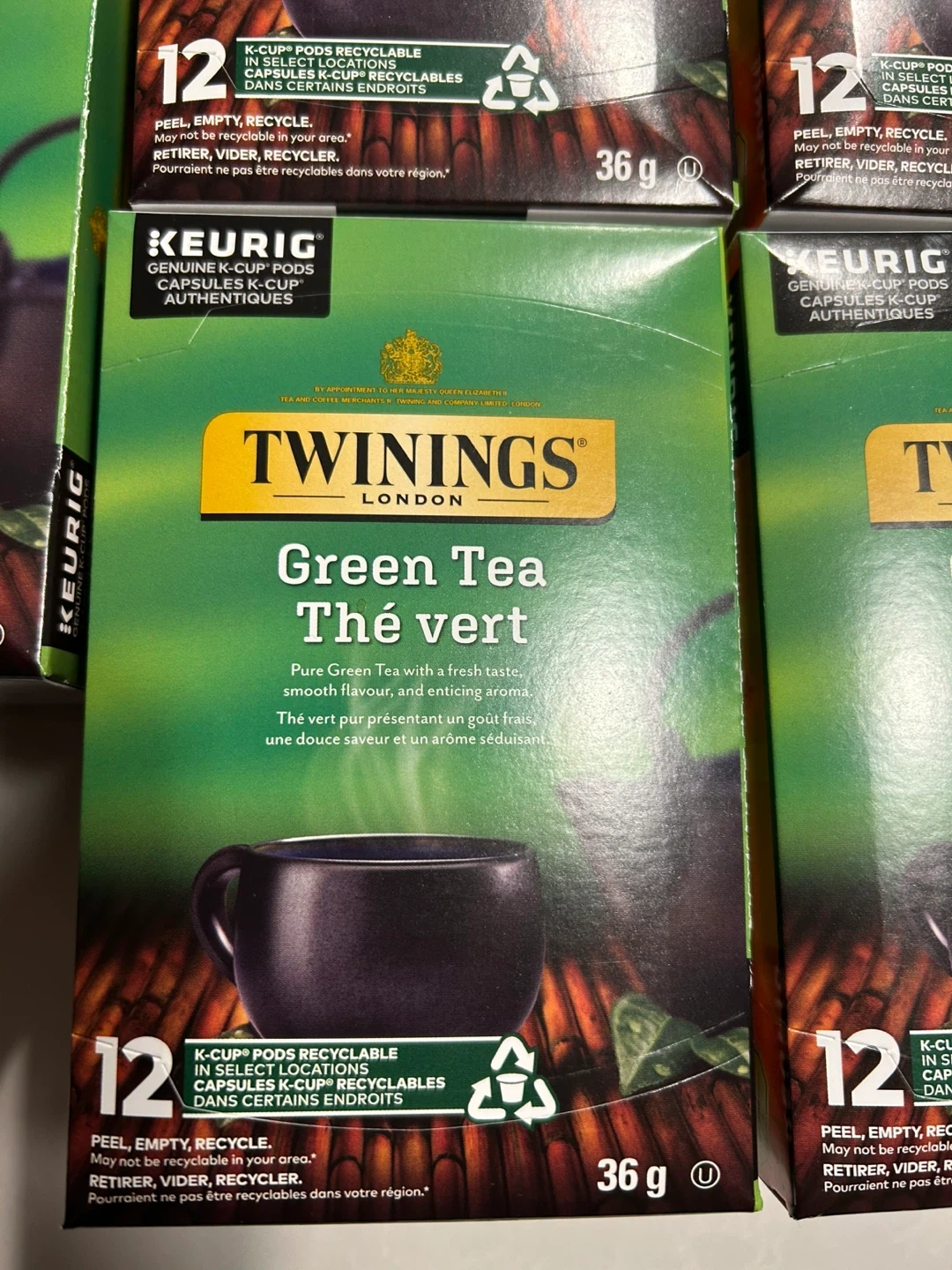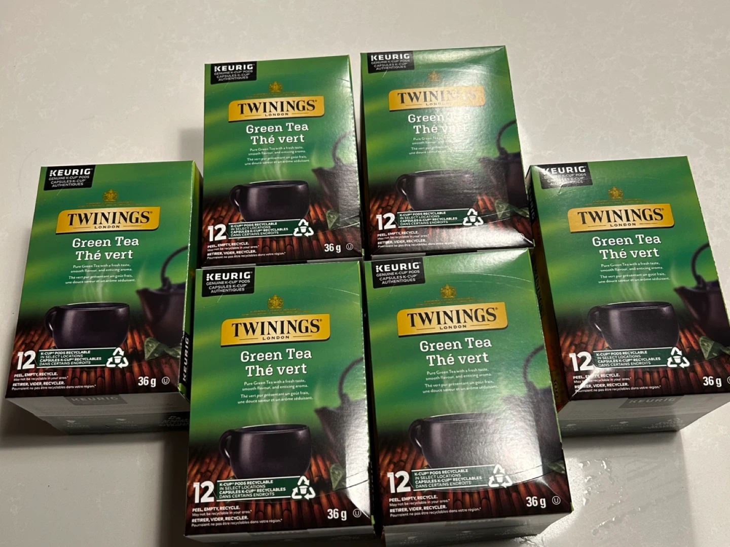 Selling SIX BOXES pf Twinings Green Tea K-Cup pods. Each box contains 12 K-Cup pods. These are perfect for your Keurig machine! Best before March 28, 2028