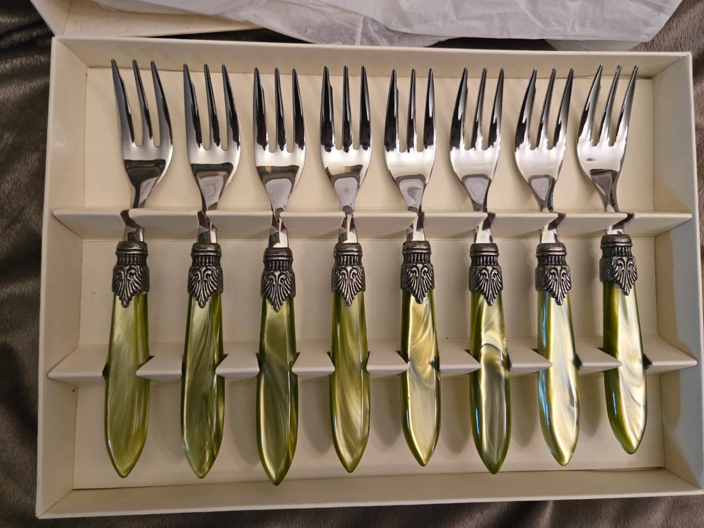 They are made with high-quality 18/10 stainless steel and feature unique olive green handles. They come in their original box and have never been used.