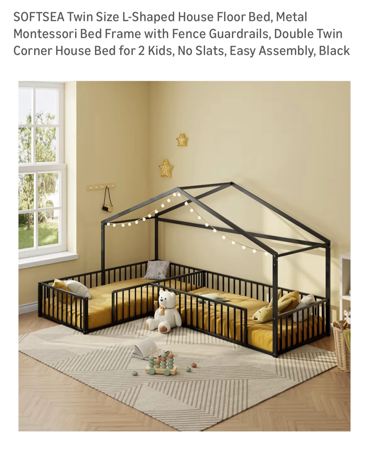 Selling a SOFTSEA Twin Size L-Shaped House Floor Bed in black. It features a metal Montessori bed frame with fence guardrails. Designed as a double twin corner house bed for 2 kids. Easy to assemble and does not include slats. Dimensions are approximately 77" x 116.5" x 61.5".