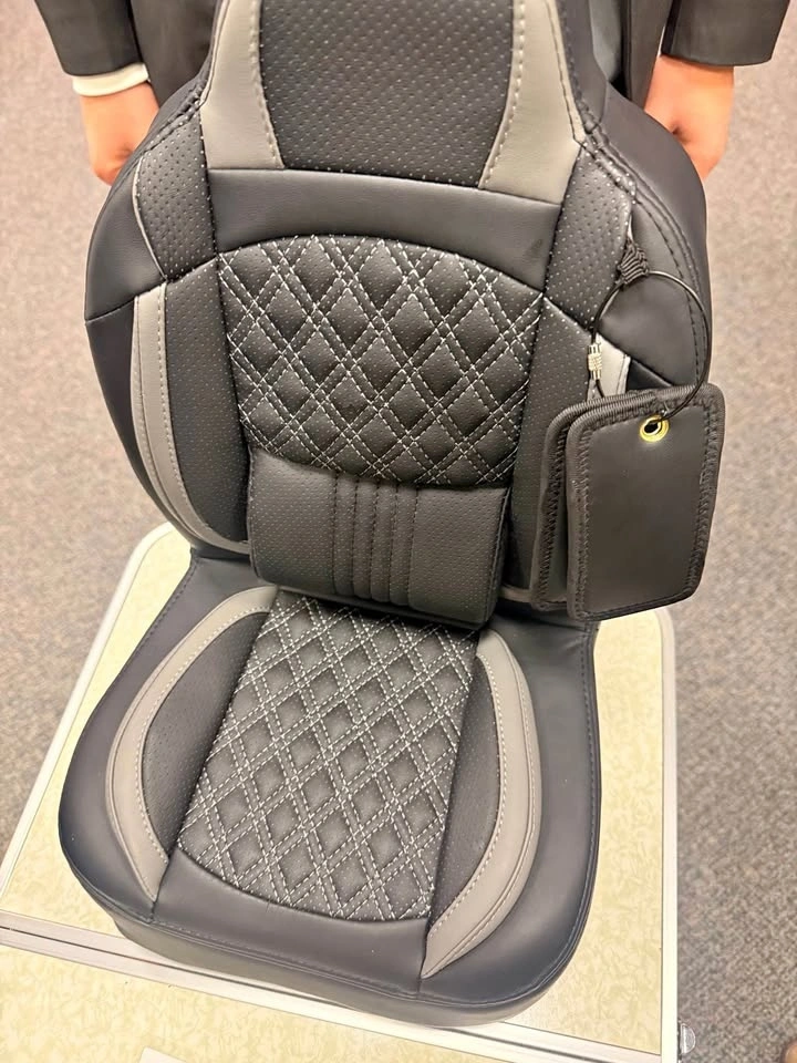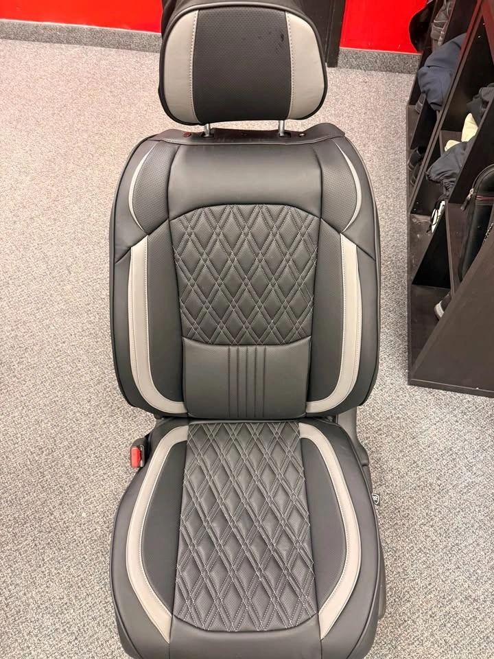 Instant upgrade for any car or truck. Premium leather feel, memory foam comfort, non slip grip, kid and pet proof. Two colours available: all black or black with cool grey.