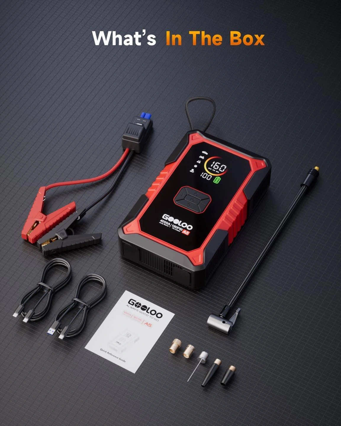 GOOLOO A5 jump starter is a 4-in-1 kit that combines a jump starter, tire inflator, 20,000mAh power bank, and LED light in one rugged body (8.98 × 5.55 × 2.40 in). A dependable jump starter to keep in the trunk for daily use, road trips, and emergencies.
